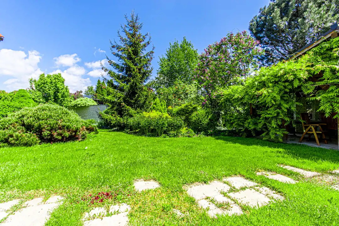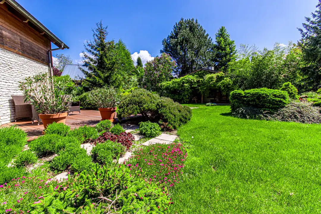 Działka jest w pełni zagospodarowana i ogrodzona – z przodu ogrodzenie z kamienia i drewna, z tyłu domu solidny mur kamienny. W ogrodzie znajduje się duża altana kryta blachą miedzianą, automatyczne nawadnianie oraz oświetlenie, które tworzy niepowtarzalny klimat.