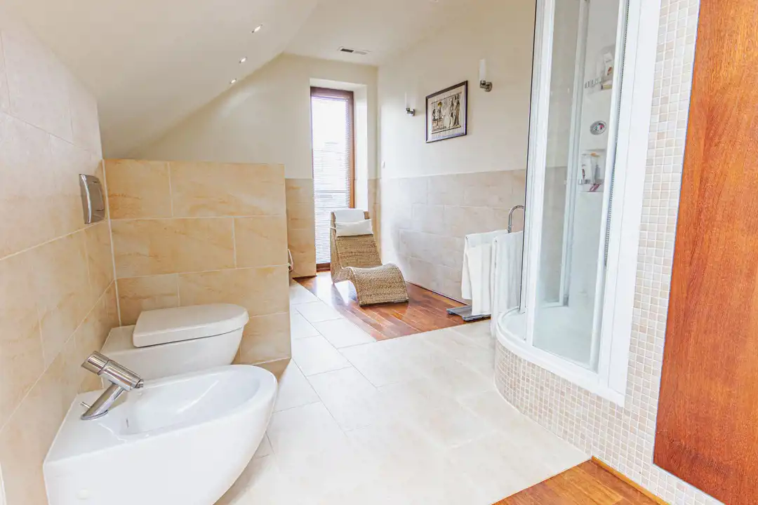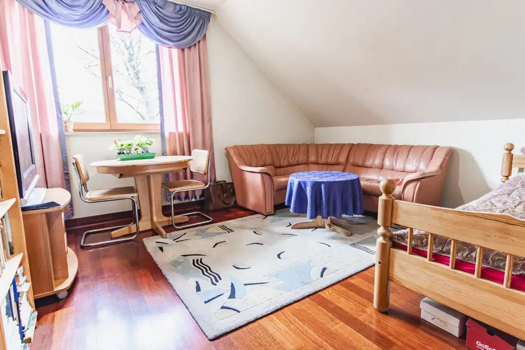 Piętro: 3 duże sypialnie, pralnia, łazienka z wanną i prysznicem.