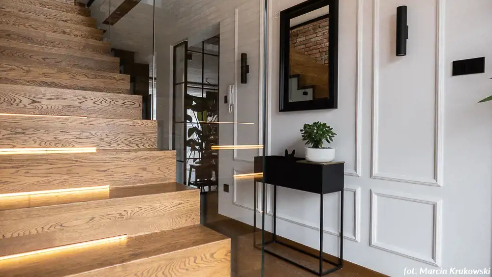 zbudowany wg projektu Dom w Kalwilach. Wykończony z wysokiej jakości materiałów z najwyższą starannością i dbałością o detale. Na podłogach deska lity dąb, w łazienkach włoskie płytki, zabudowa meblowa MDF lakierowany, biokominek. Dom wyposażony w instalację fotowoltaiczną, dwa niezależne piece gazowe, klimatyzację sterowaną telefonem, instalacja alarmowa. W ogrodzie trawa z rolki, automatyczne nawadnianie, oświetlenie ledowe. Ogrzewanie gazowe, w apartamencie dwupoziomowym ogrzewanie podłogowe w kuchni i łazienkach.