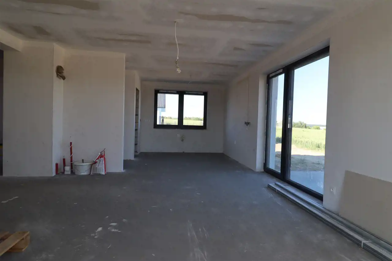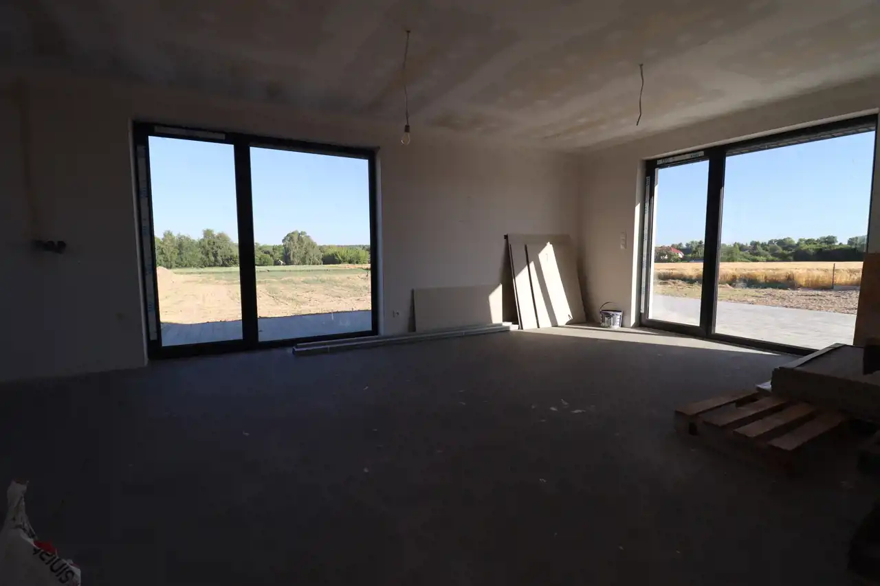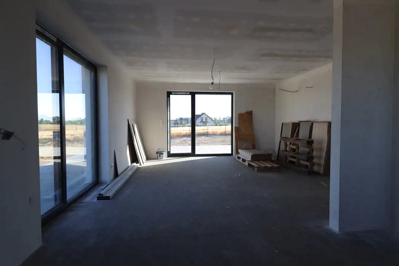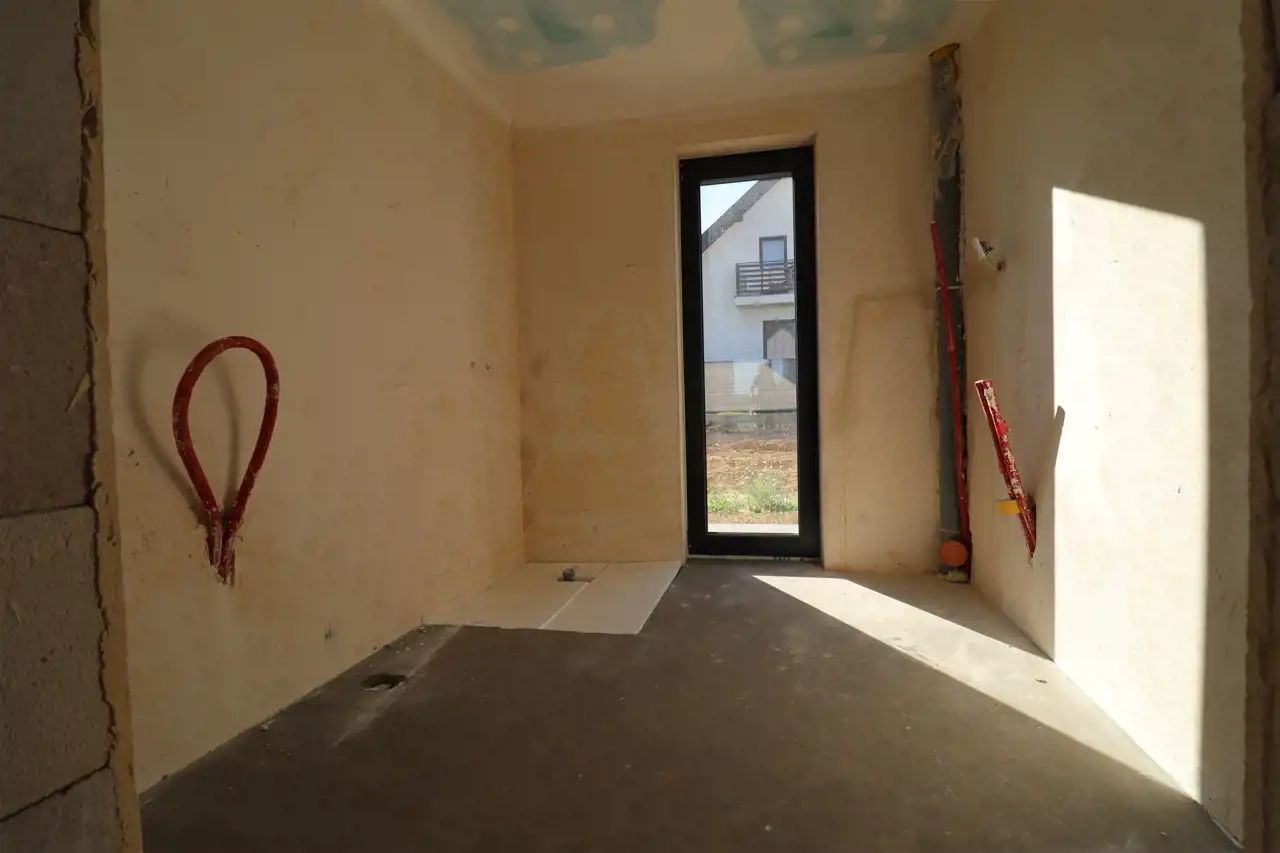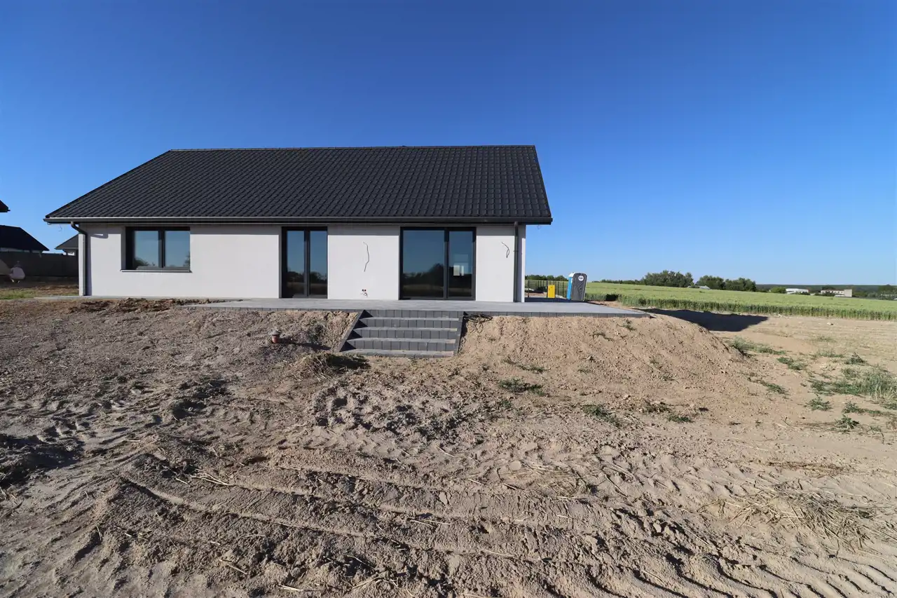 Obecnie w trakcie prac /stan surowy otwarty, budynek wykonany z porothermu, docieplony styropianem grafitowym, kryty dachem z blachodachówki. Położony na płaskiej działce o powierzchni ok 1000m2, w piątej linii zabudowy.