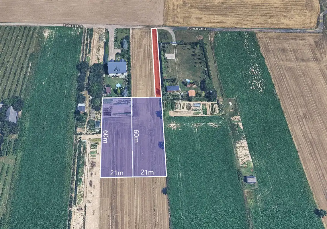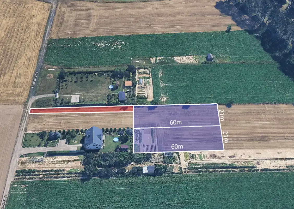 Prezentowana nieruchomość o powierzchni 1240 m² usytuowana jest w drugiej linii zabudowy, co zapewnia przyszłym mieszkańcom ciszę i prywatność, chroniąc ich przed bezpośrednim zgiełkiem ulicznym. Dojazd do działki od ulicy Folwarcznej, odbywa się poprzez drogę na zasadzie służebności przejazdu i przechodu przez działki położone w pierwszej linii zabudowy.