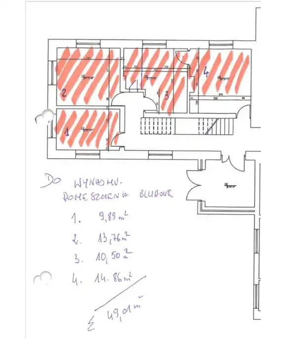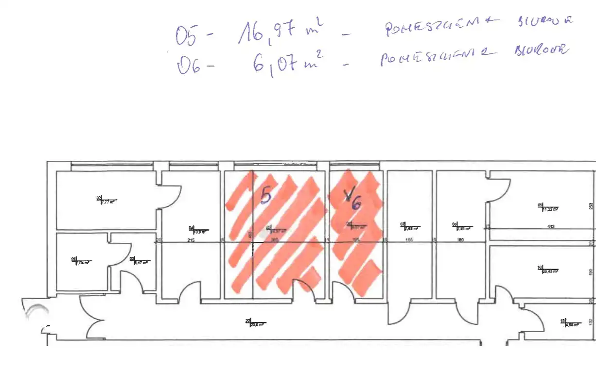 - biura 6,07m2; 16,97m2 (obok siebie) oraz 9,89m2; 13,76; 10,5m2; 14,86m2 (kolejno obok siebie) oraz placu - czynsze do ustalenia,