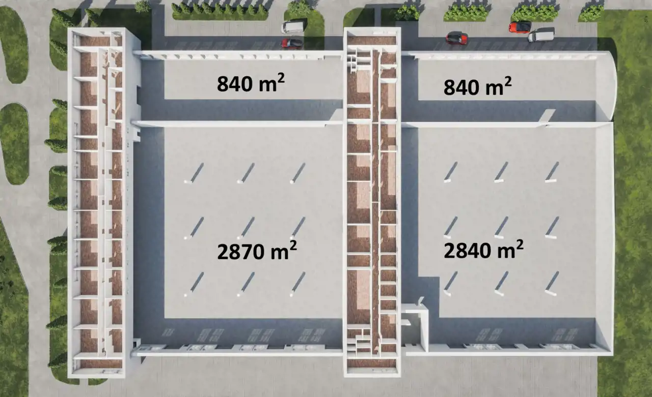 7390m2 powierzchni produkcyjnej, z możliwością podziału na moduły 2840 m2, 2870 m2 , 840 m2, 840m2