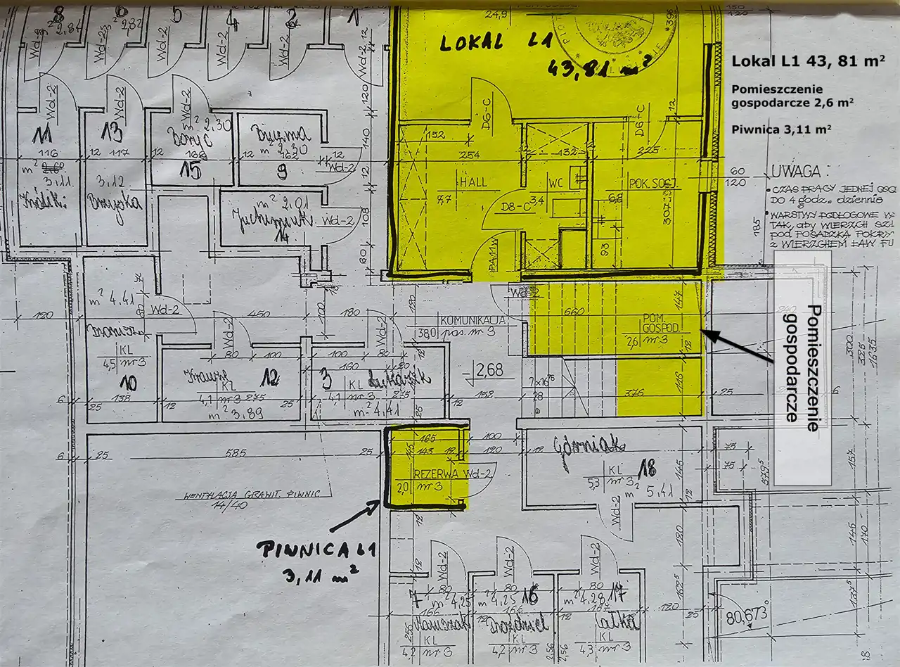 Dodatkowo do lokalu przynależą piwnica 3,11 m2 oraz pomieszczenie gospodarcze 2,6 m2