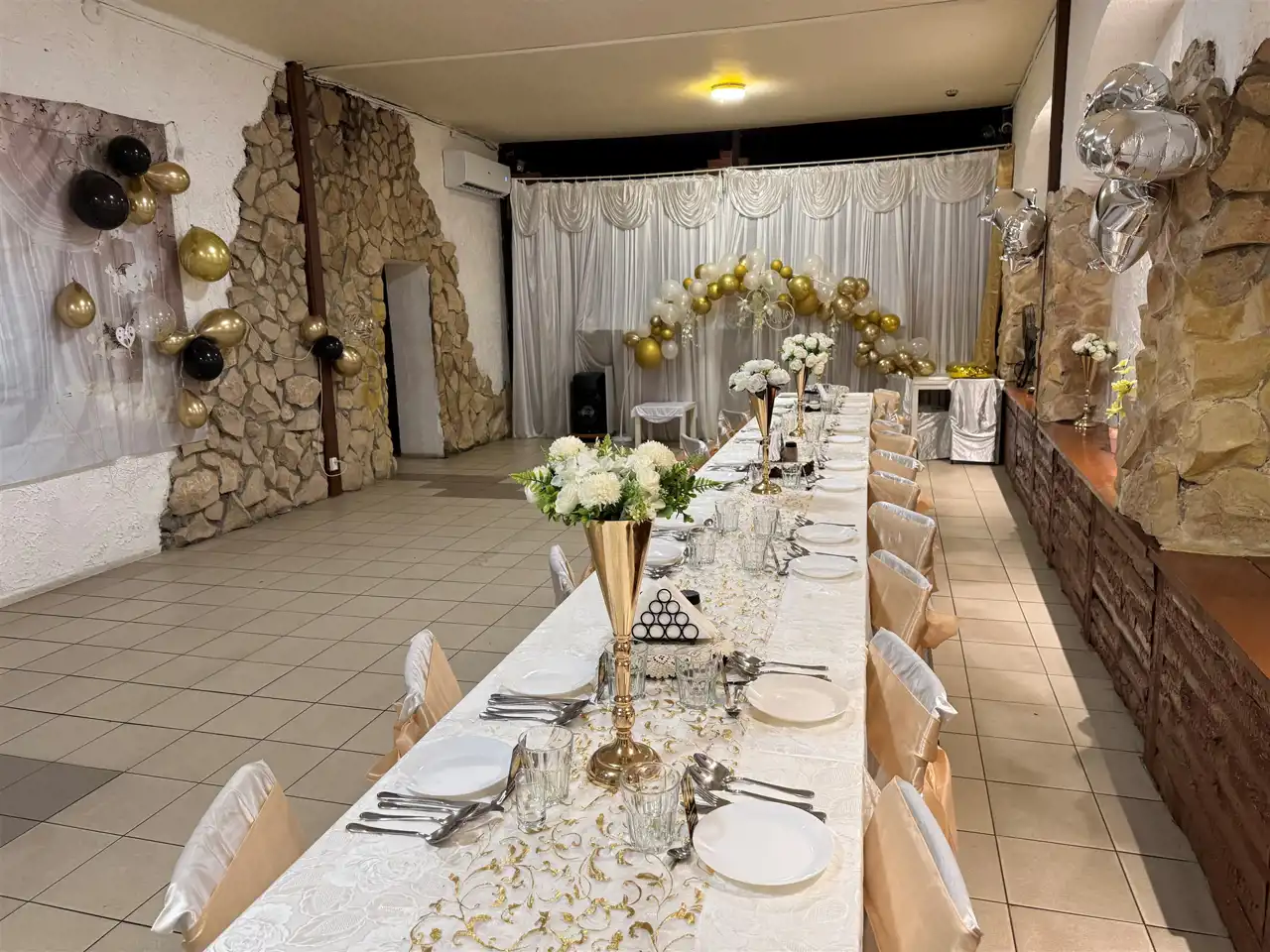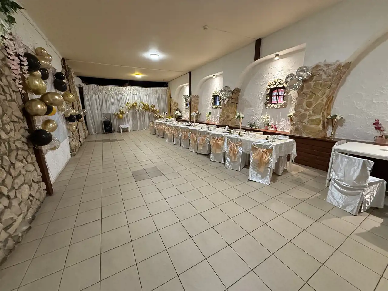 Lodówki, kuchenka gazowa gastronomiczna,kuchenka elektryczna, zamrażarki, wyparzarkę do naczyń, zastawę stołową na około 60 osób (szkoło, porcelana) stoły i krzesła, wyposażenie baru itp.