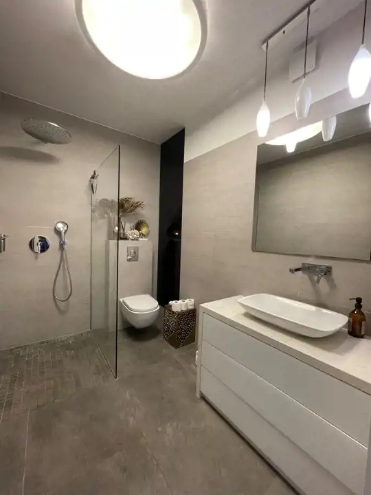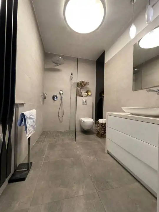 Łazienka z kabiną typu walk-in "wtapianą" w posadzkę, odpływ liniowy, umywalka nablatowa, blat kwarcyt, armatura podtynkowa Grohe, ładnie schowany piec gazowy z miejscem do przechowywania, nowoczesny dekoracyjny grzejnik.