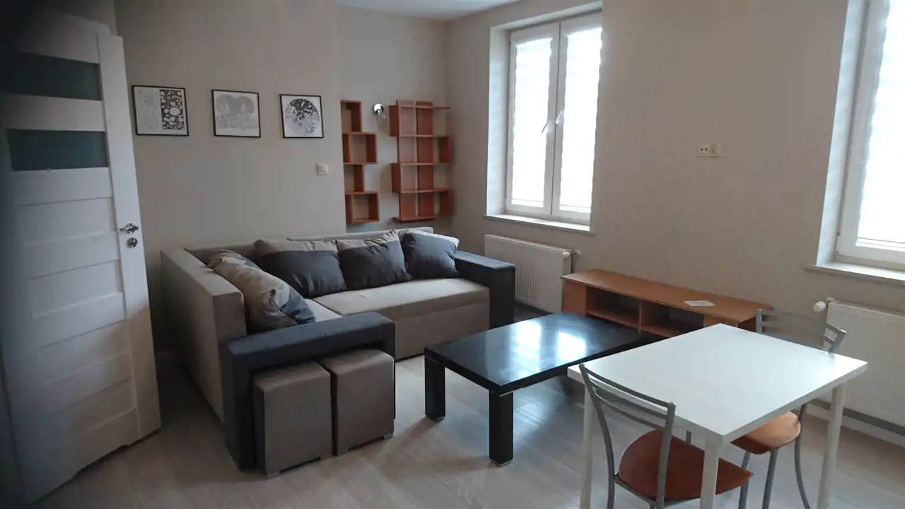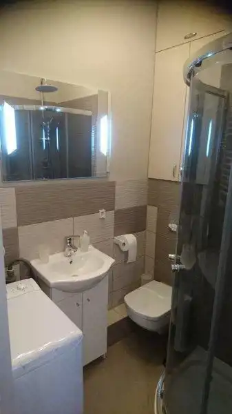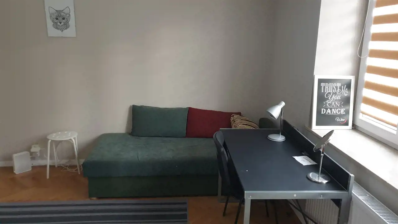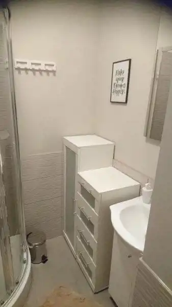 * lokal nr 2 o pow. ok. 25 mkw: przestronna kawalerka na planie otwartym + (z pełnym wyposażeniem i umeblowaniem) + łazienka (z kabiną prysznicową, WC, umywalką i pralką)