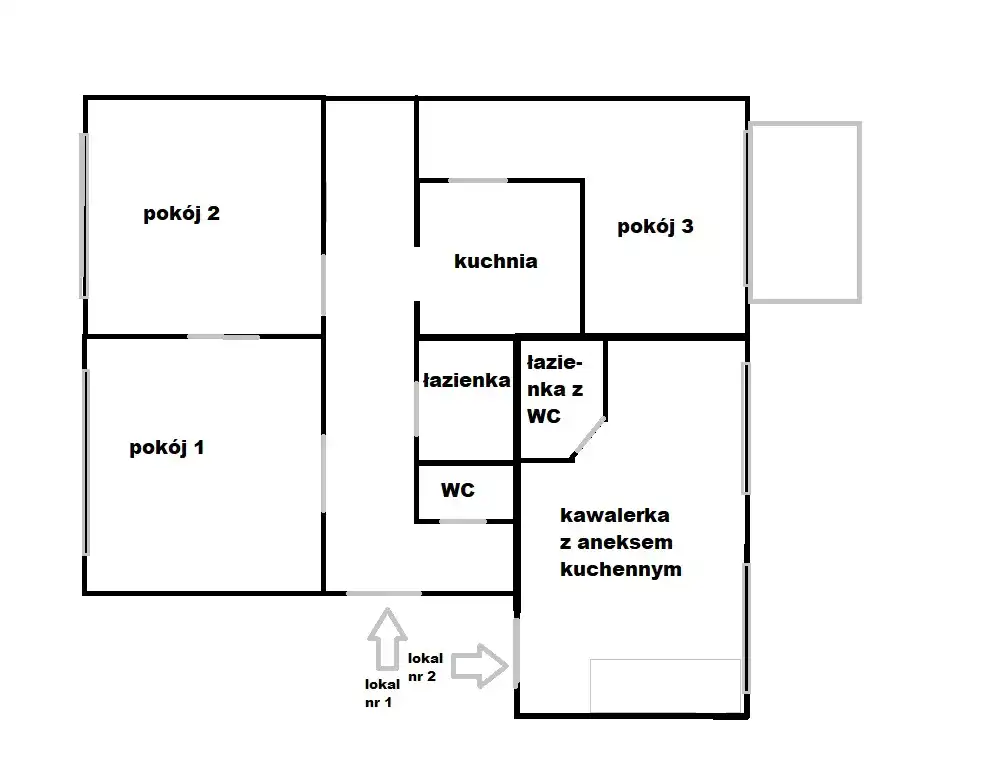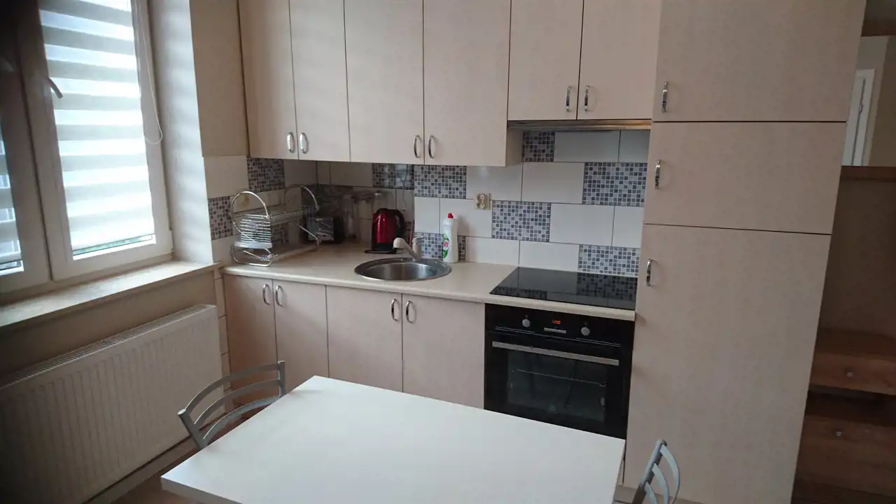 * lokal nr 1 o pow. ok. 73 mkw: 3 oddzielne duże sypialnie (każdy z pokoi przygotowany do zamieszkania dla 1-2 osób, wyposażony w łóżka, biurko, szafy) + oddzielna kuchnia (z pełnym wyposażeniem i umeblowaniem) + łazienka (z kabiną prysznicową) + WC (toaleta, umywalka , pralka) + holl (z garderobą)