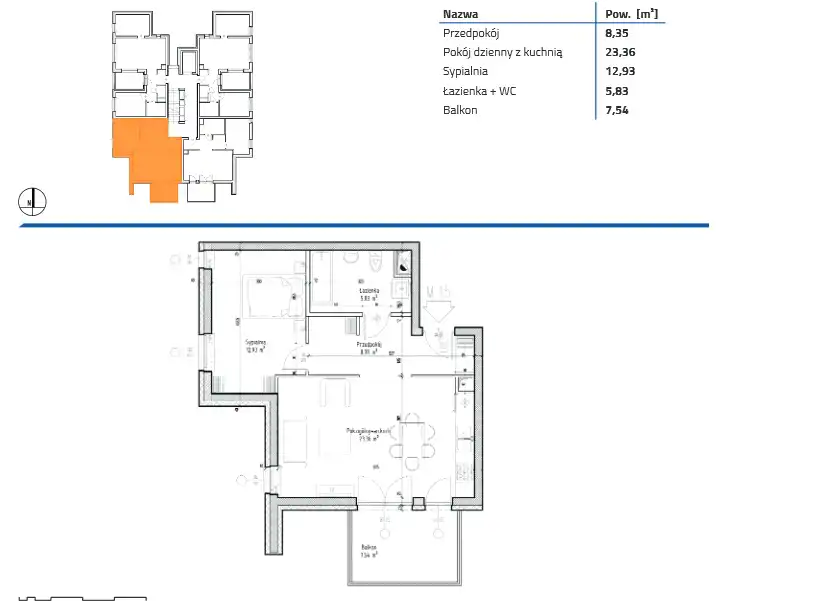- Charakterystyka mieszkania 50.47 m2, 2 pokoje