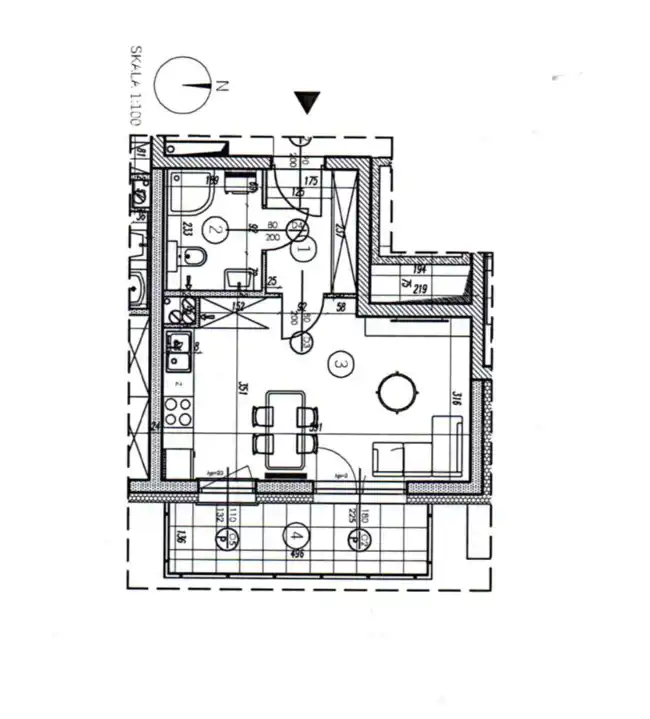 Mieszkanie obecnie jednopokojowe z aneksem kuchennym, ale można postawić ściankę oddzielając kuchnię od salonu albo tworząc pokój dzienny z aneksem kuchennym oraz oddzielną sypialnię.