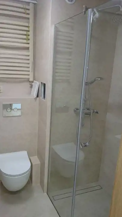 Łazienka z kabiną prysznicową, umywalką i WC.