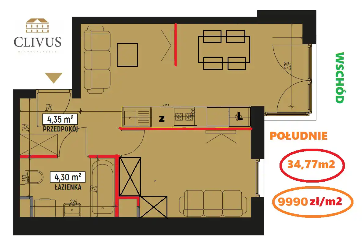 - Charakterystyka mieszkania 34.77 m2, 2 pokoje