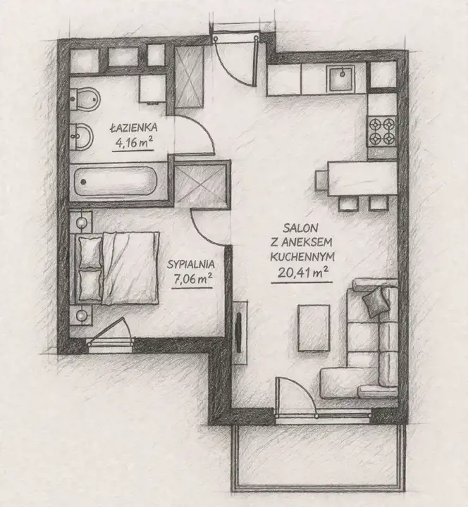 - Charakterystyka mieszkania 31.63 m2, 2 pokoje