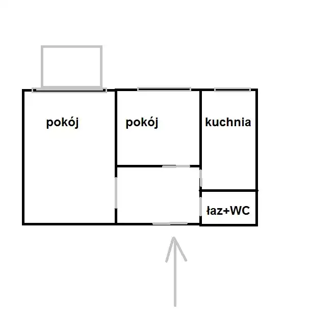 Rozkład mieszkania: duży pokój z balkonem, mały pokoik, kuchnia (widna), łazienka z WC i przedpokój.