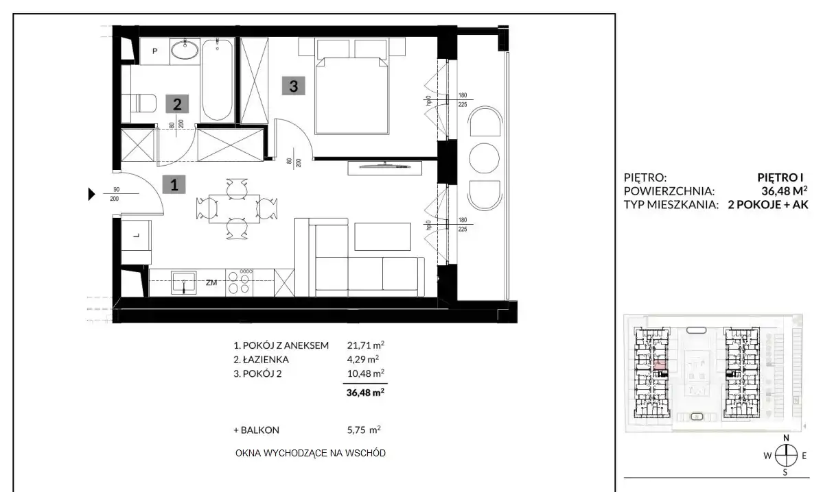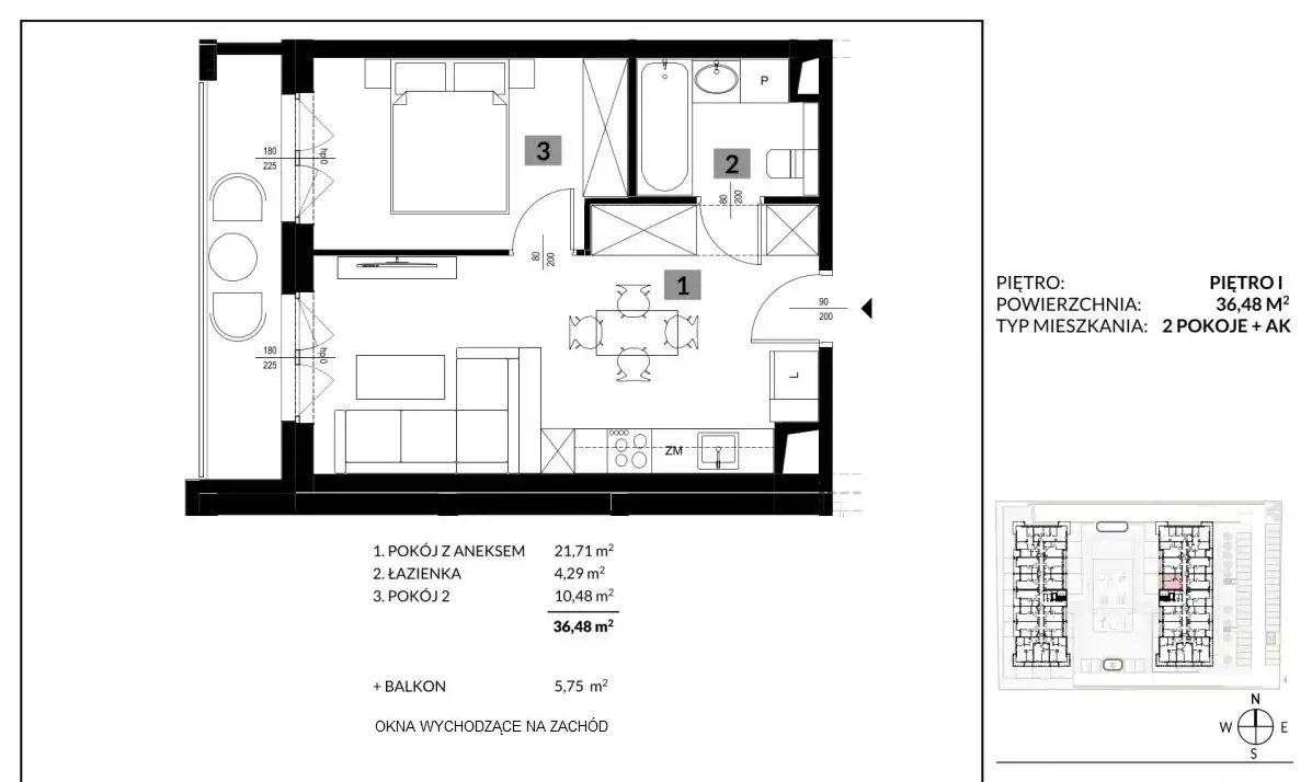* Apartament 2 pokoje o pow. 36,48m2 (piętro 1) z balkonem 5,75m2