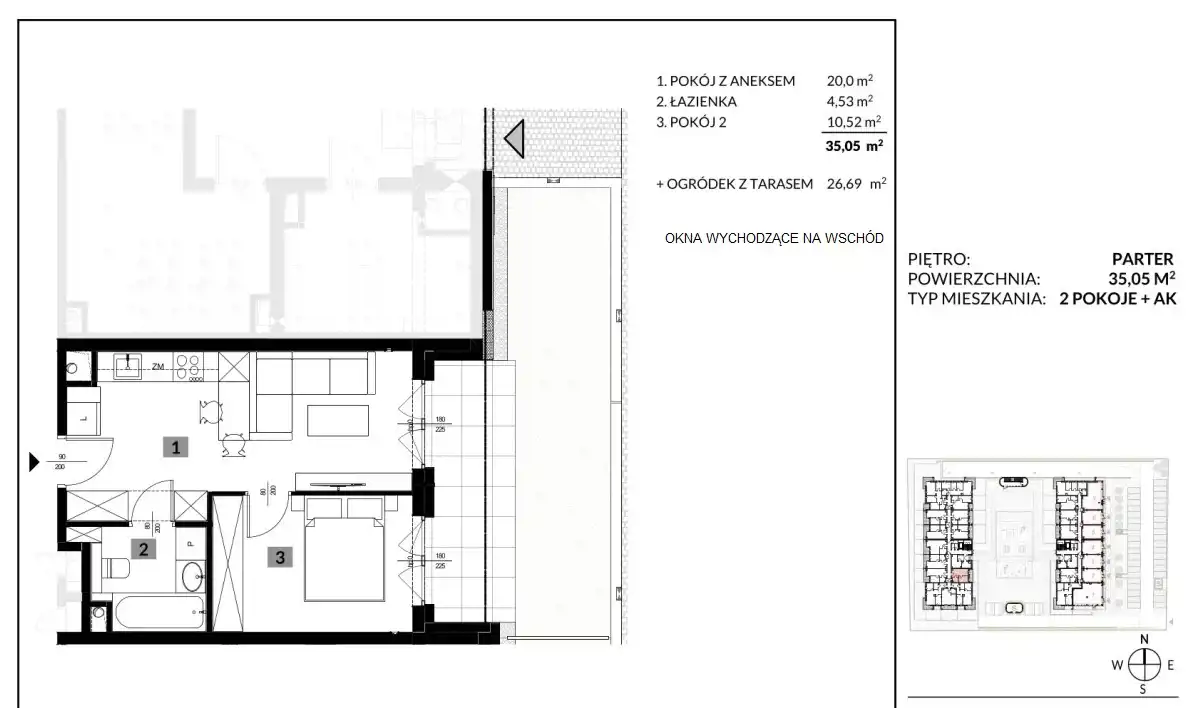 * Apartament 2 pokoje o pow. 35,05m2 (parter) z ogródkiem 26,69m2