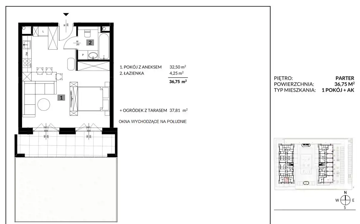* Apartament 1 pokój o pow. 36,75m2 (parter) z ogródkiem 37,81m2