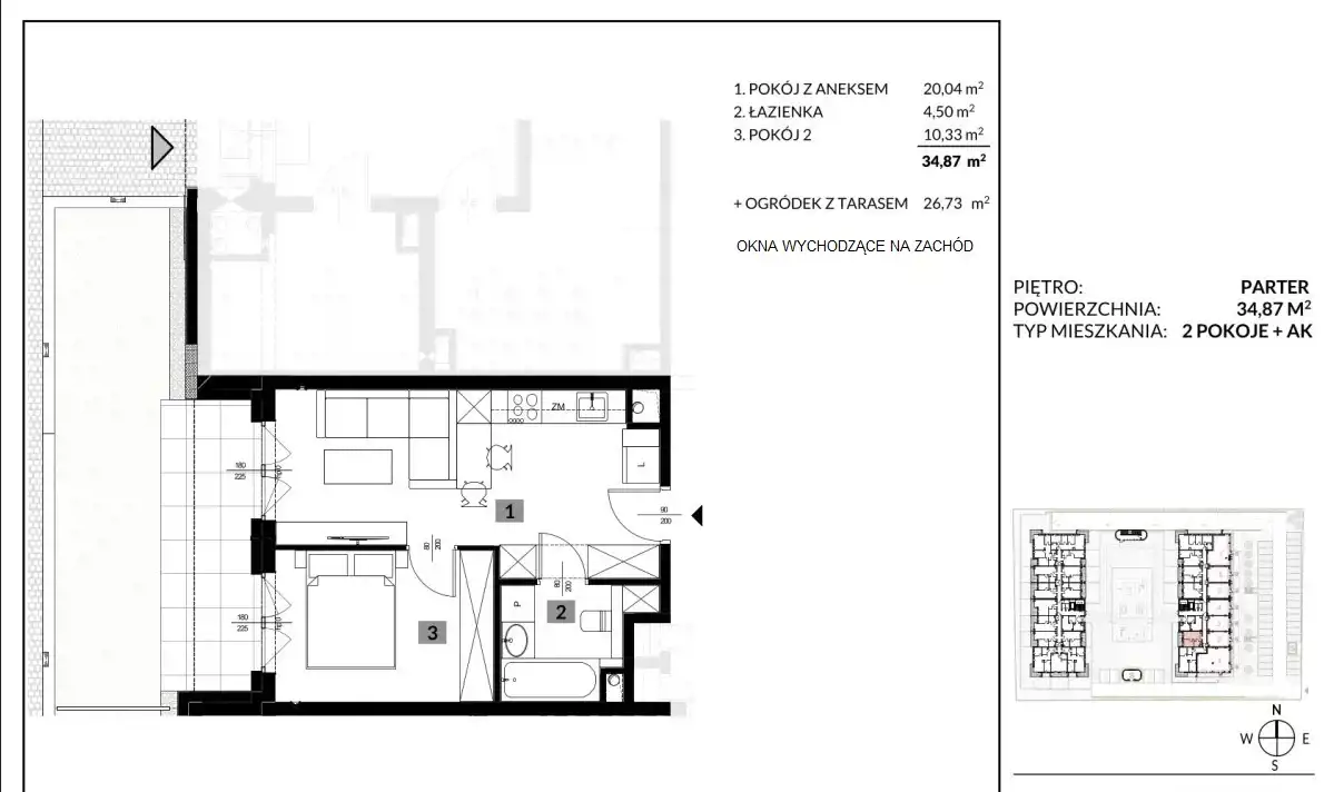 * Apartament 2 pokoje o pow. 34,87 (parter) z ogródkiem 26,73m2