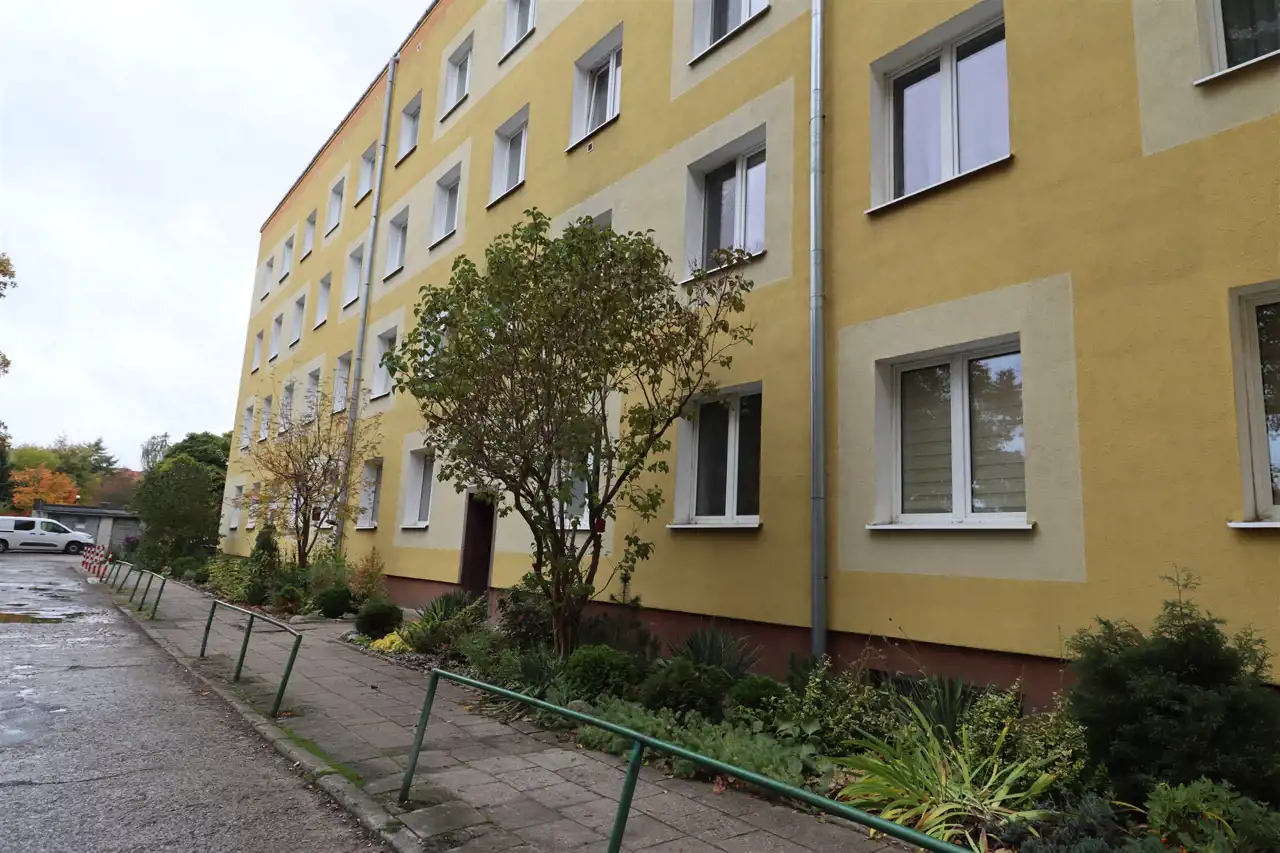 Mieszkanie ciepłe, położone na pierwszym piętrze bloku z cegły w niskiej zabudowie.