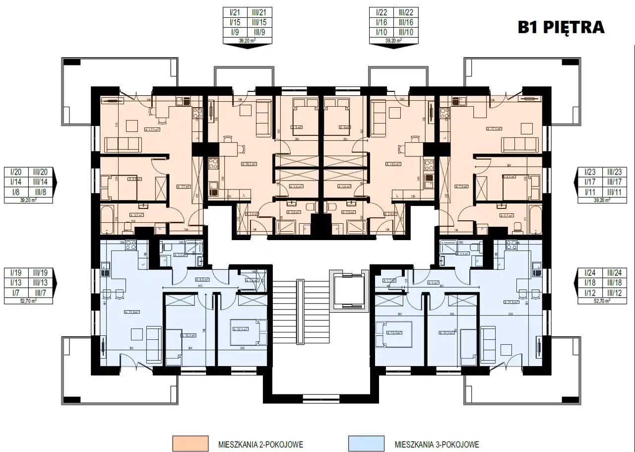 ( Salon z aneksem kuchennym + sypialnia ), usytuowane na wysokim parterze oraz na piętrach od parteru do 3 w budynku 2.