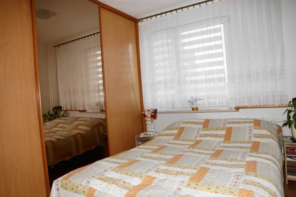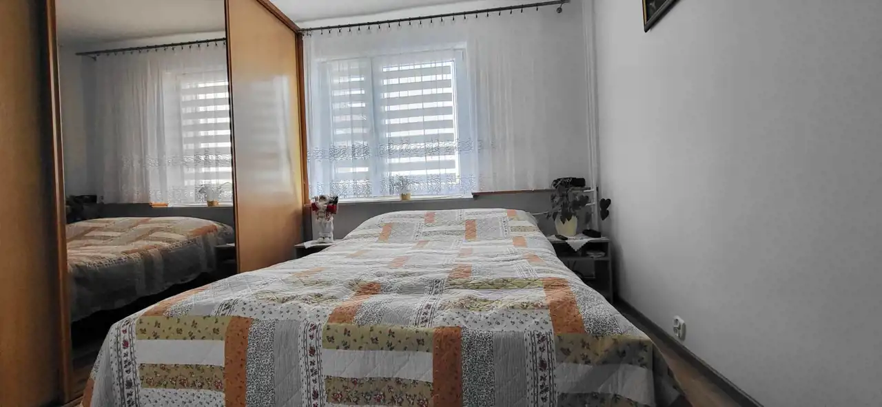 Mieszkanie o powierzchni prawie 46m2 składa się z dwóch pokoi, kuchni, przedpokoju, łazienki oraz WC. Z przestronnego pokoju dziennego z 2 oknami wychodzi się na duży balkon. Okna z PCV, na podłogach parkiet, panele oraz terakota. Do mieszkania przynależy piwnica.