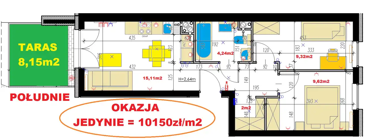 - Charakterystyka mieszkania 45.15 m2, 3 pokoje