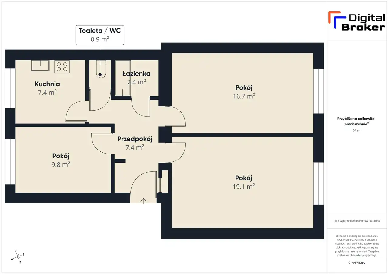 Na 62 m2 znajdują się (sprawdź rozkład na załączonym planie oraz spacerze wirtualnym):