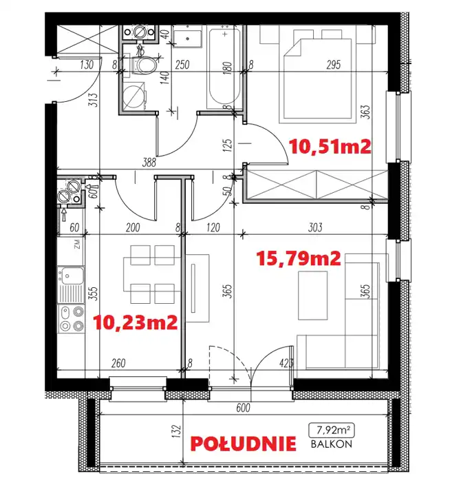 - Charakterystyka mieszkania 47.68 m2, 2 pokoje