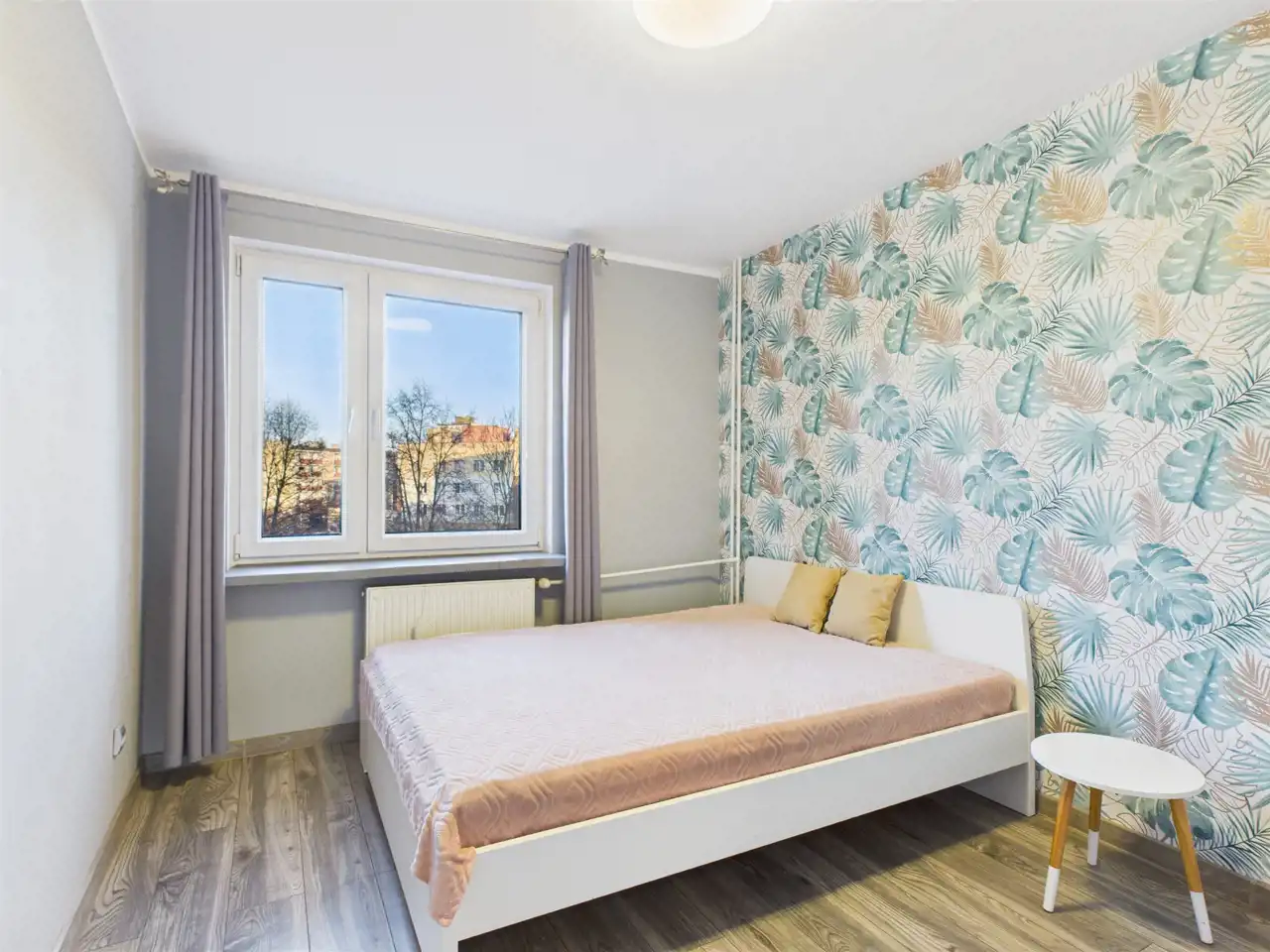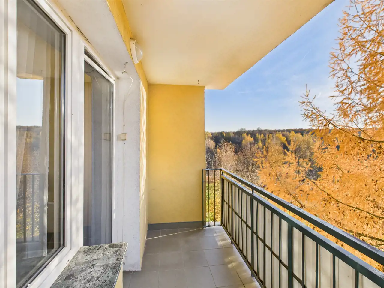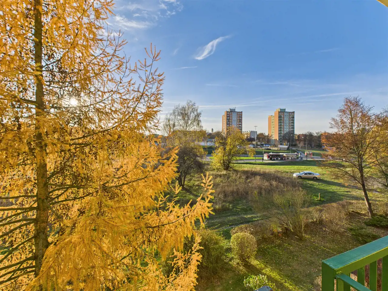 Balkon i okna salonu wychodzą w stronę lasu Stary Gaj oraz pętli autobusowej MPK (os. Widok) – brak sąsiednich zabudowań zapewnia ciszę i prywatność.