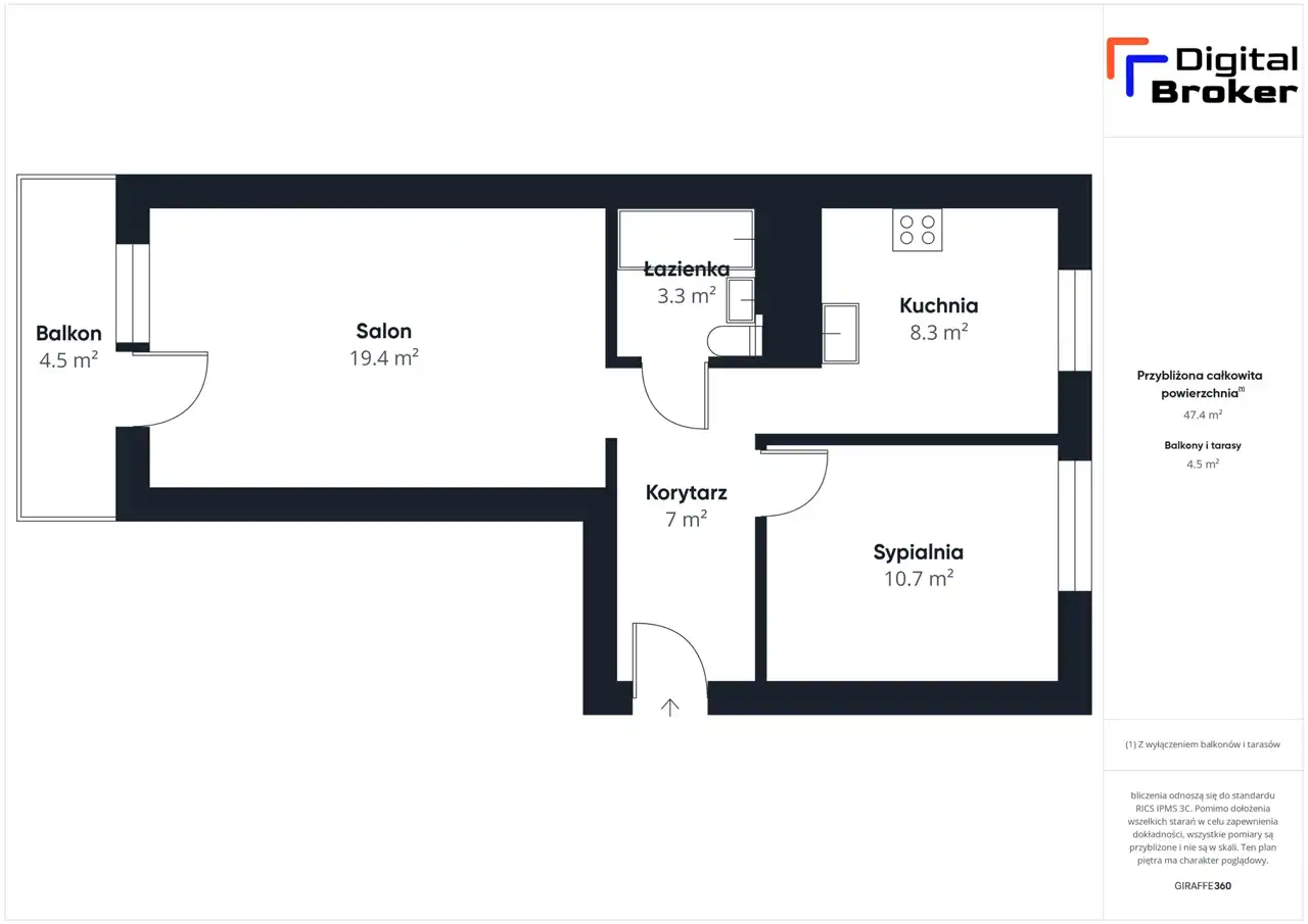 Na powierzchni 47,39 m² znajdują się: (sprawdź załączony rzut i spacer wirtualny)