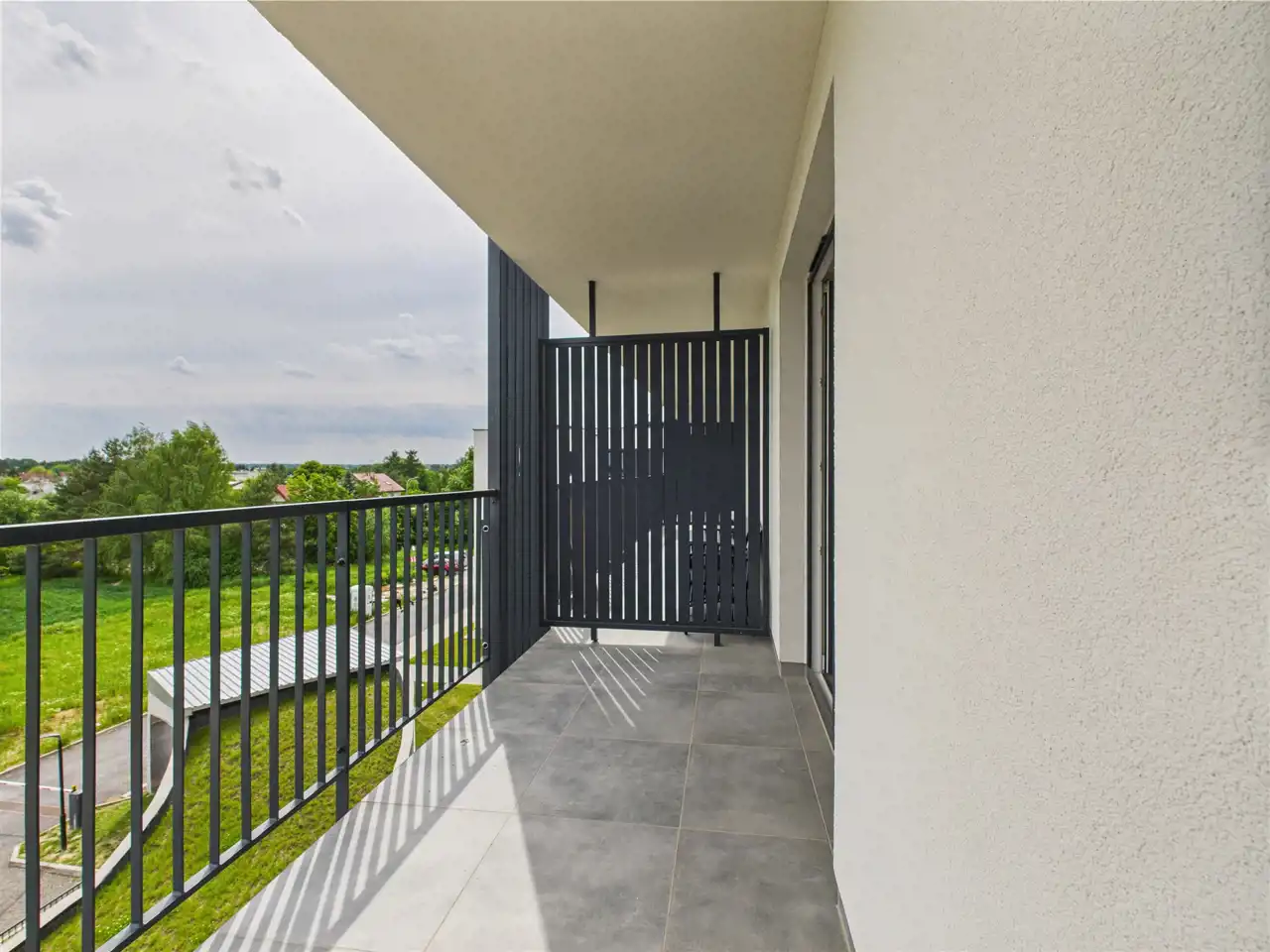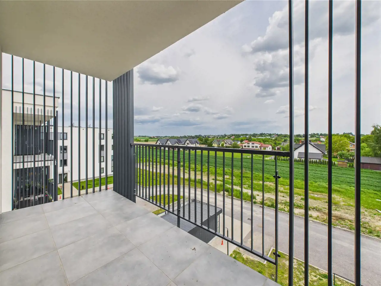 Duży balkon (7,5 m²) z widokiem na zieleń i zabudowę jednorodzinną – idealne miejsce na poranną kawę lub relaks po pracy