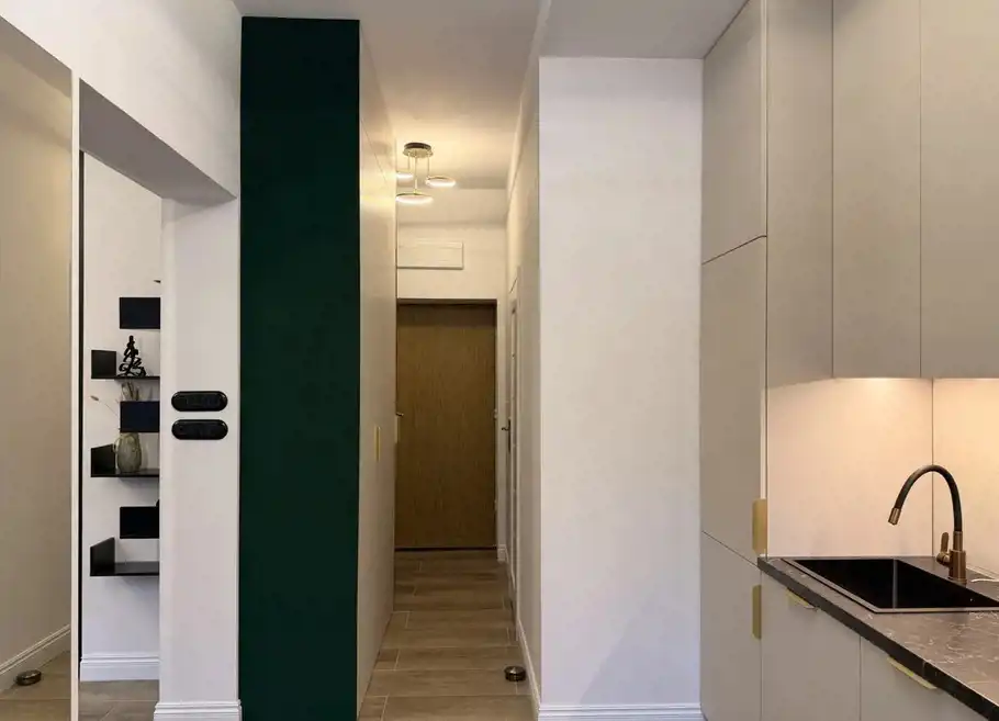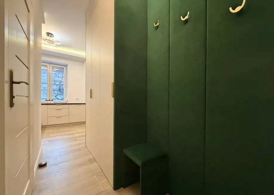 W przedpokoju znajduje się pojemna, wysoka szafa a w strefie wejścia - wykończone szmaragdowym aksamitem miejsce na garderobę wierzchnią z siedziskiem.