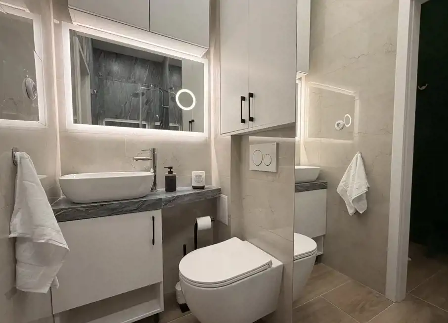 Łazienka w jednej części ma prysznic typu walk in z wyrazistą, imitującą kamień glazurą. W drugim końcu jest umywalka i WC, nad którym w szafce zabudowany został piec gazowy.
