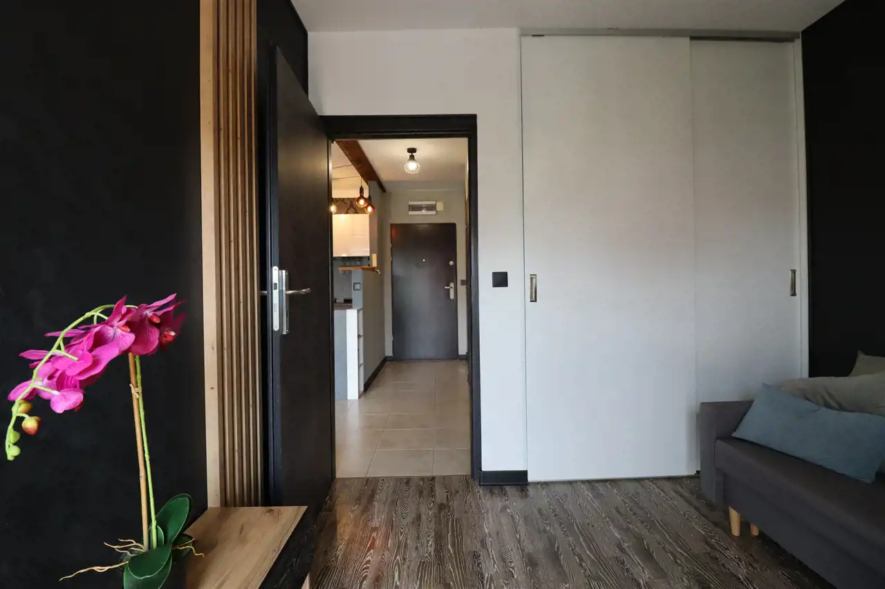 Mieszkanie usytuowane środkowo, jednostronne. Składa się z pokoju z aneksem kuchennym, osobnej sypialni, łazienki oraz przedpokoju.