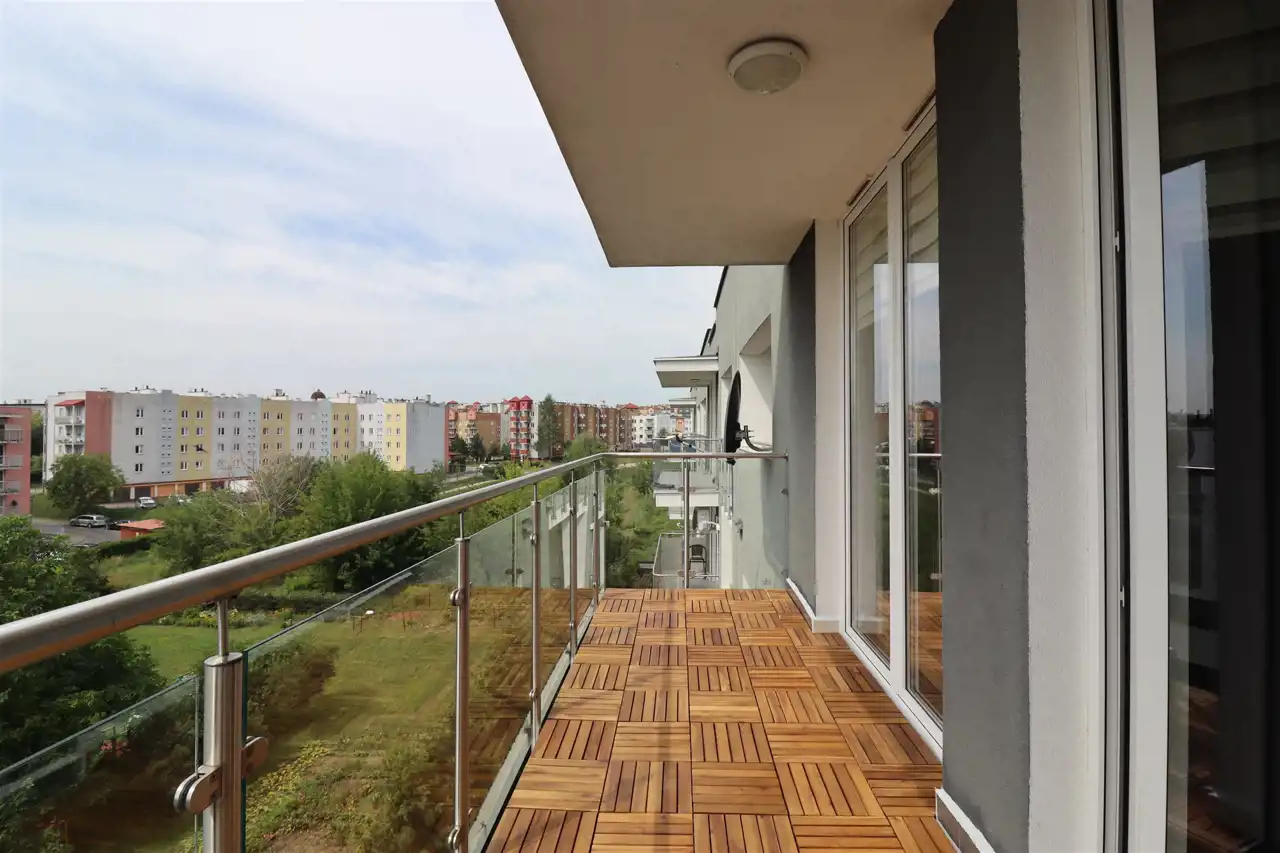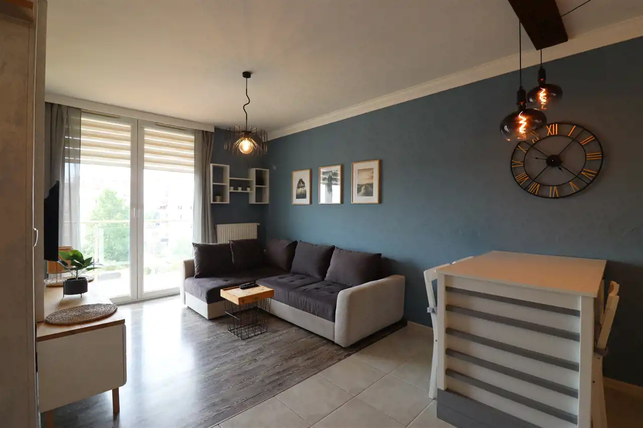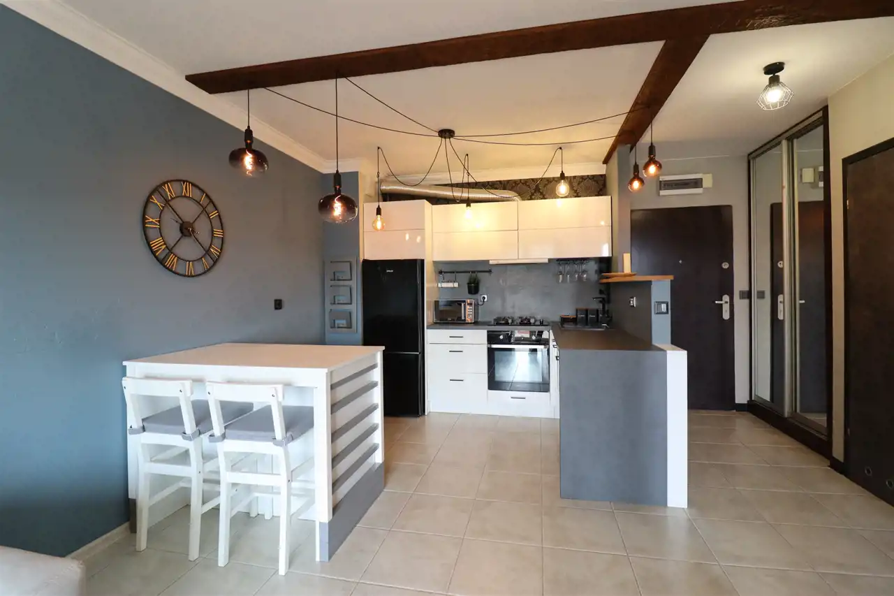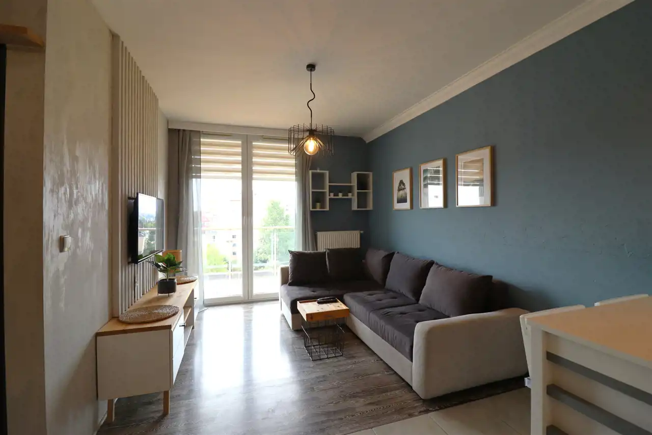 Pokój dzienny z wyjściem na przeszklony balkon. Aneks kuchenny nowocześnie zaaranżowany, wyposażony w agd.