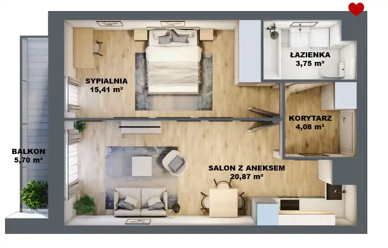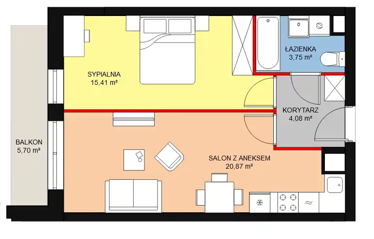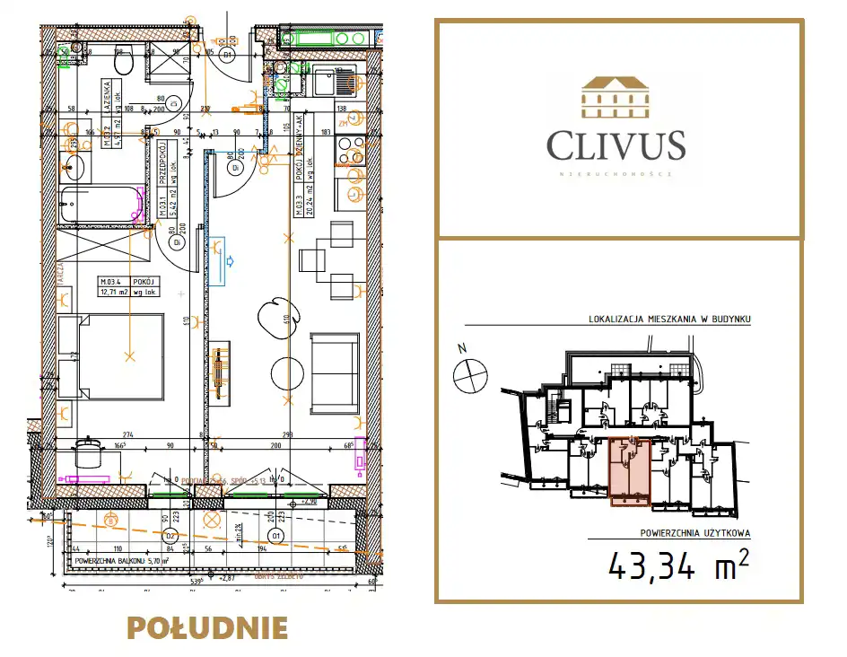 - Charakterystyka mieszkania 43.34 m2, 2 pokoje