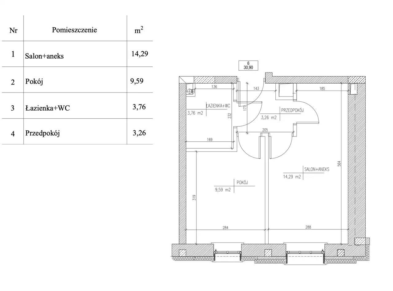 - Charakterystyka mieszkania 30.09 m2, 2 pokoje