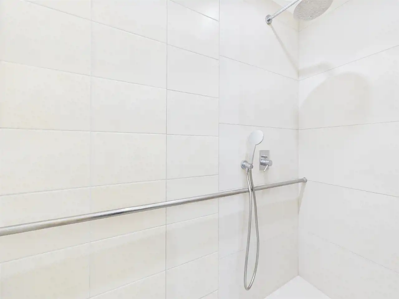 - łazienka z dużym otwartym prysznicem,