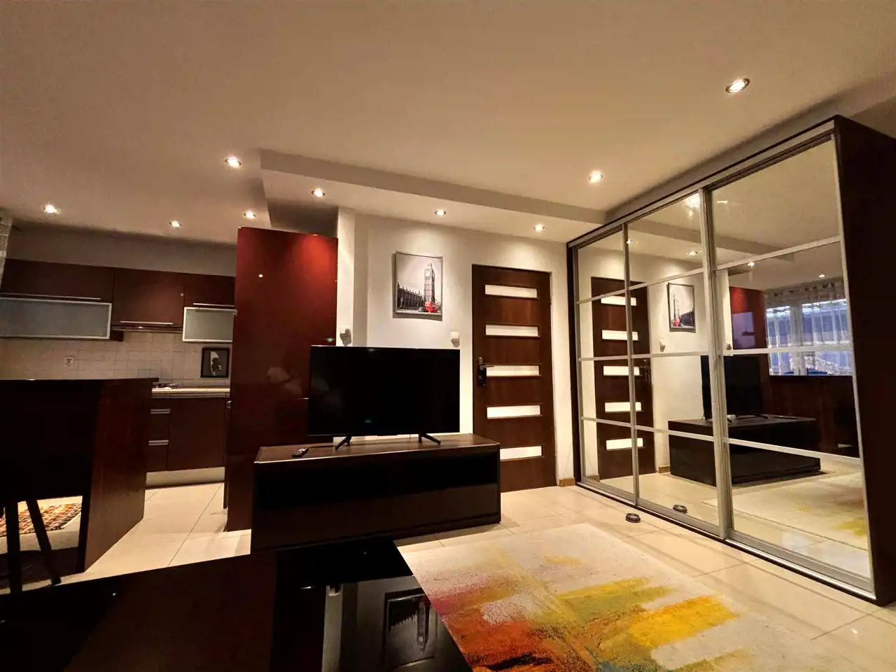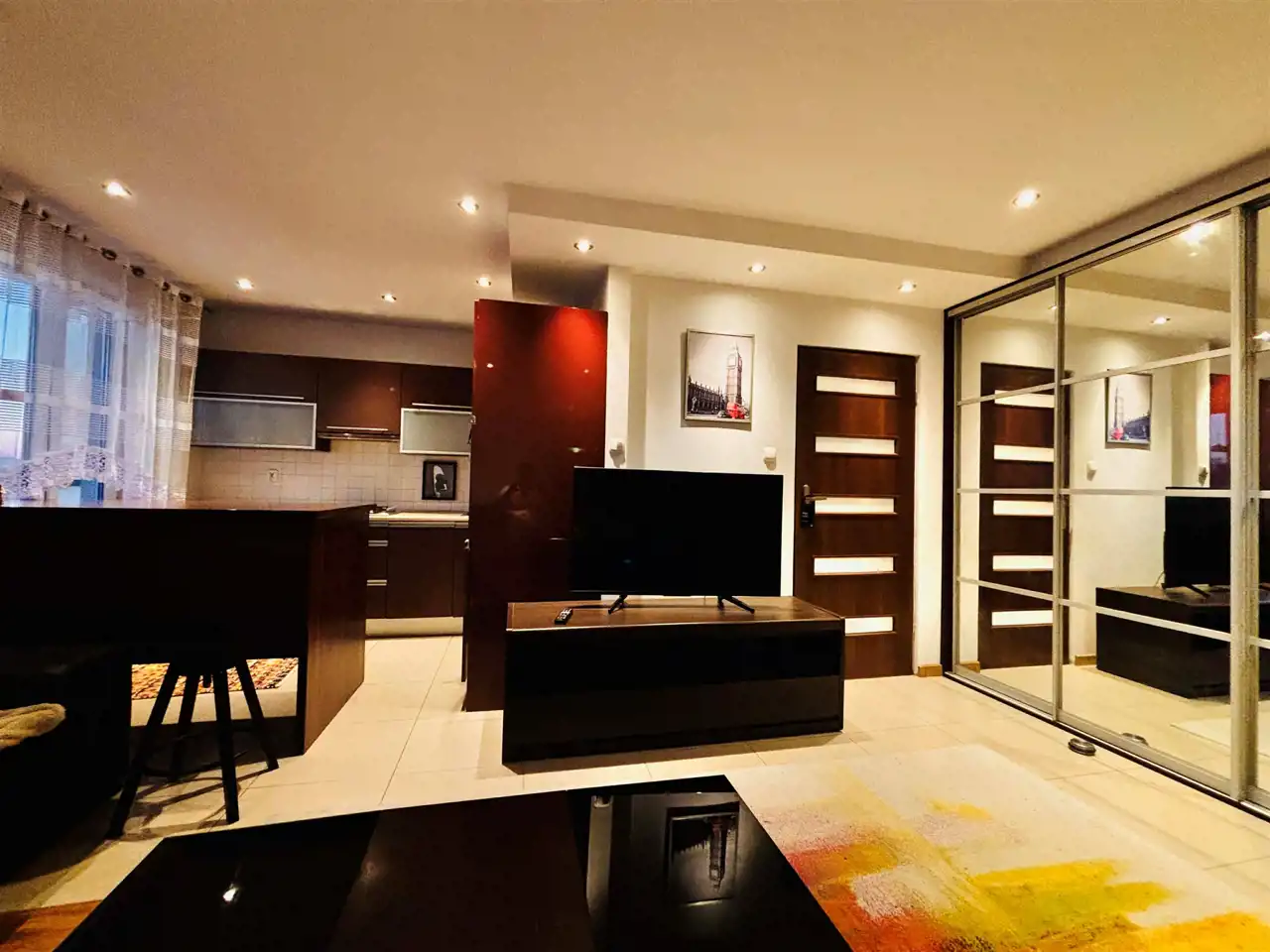 Rozkład mieszkania: salon otwarty połączony z hollem i aneksem kuchennym (na planie otwartym) + duża sypialnia + łazienka