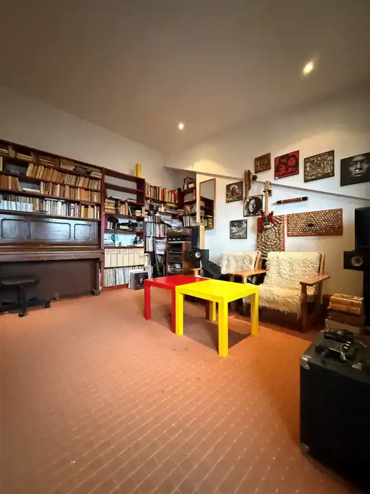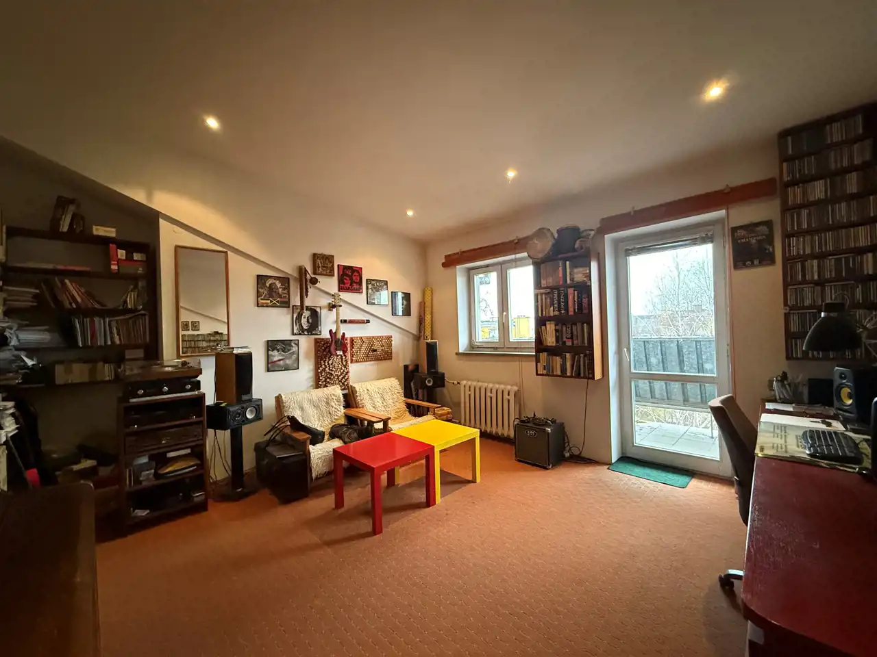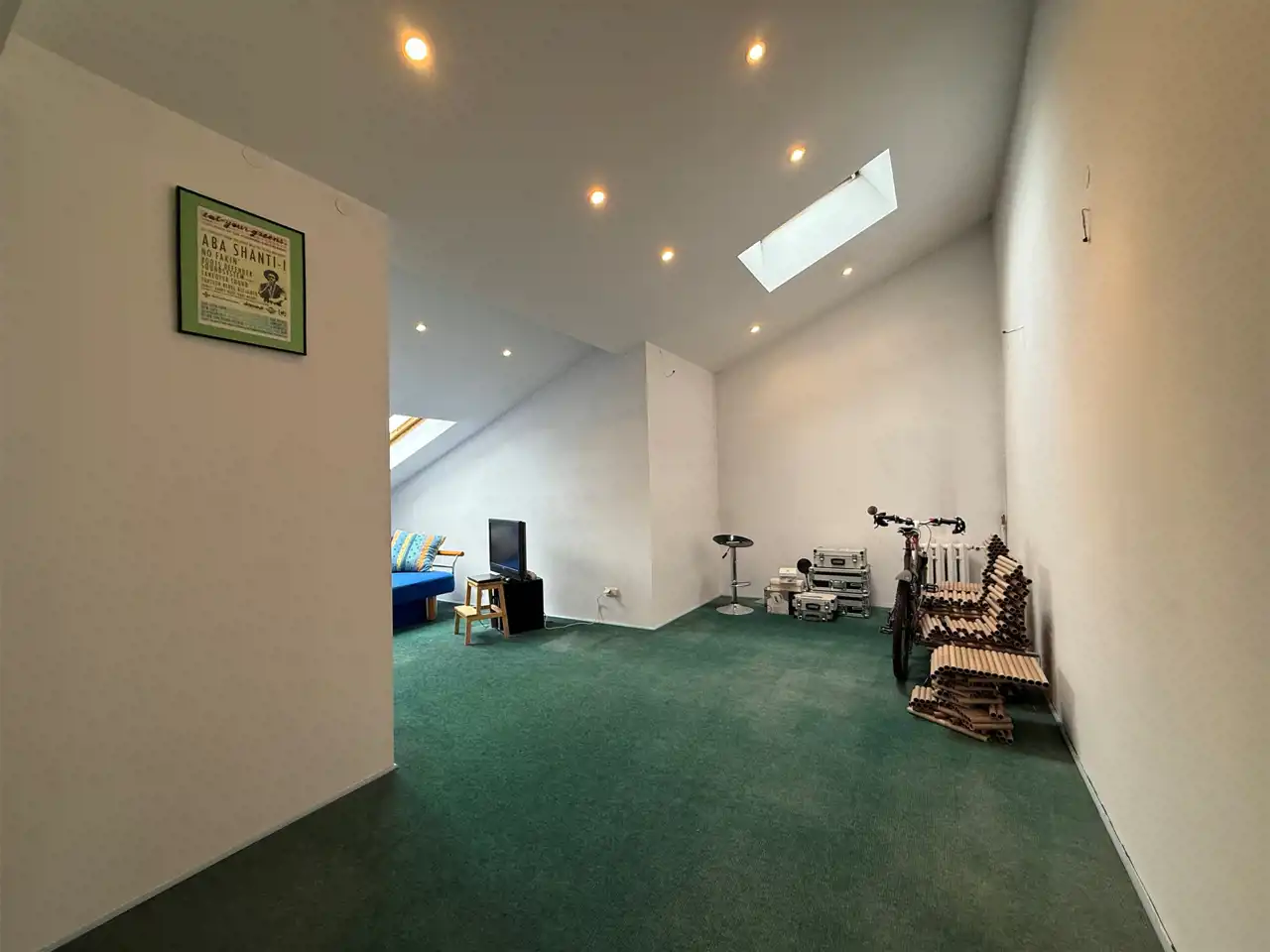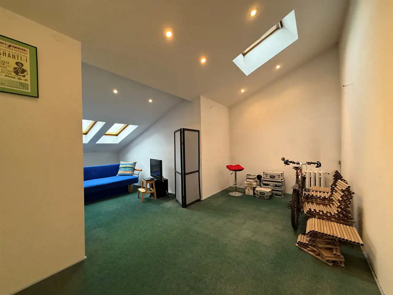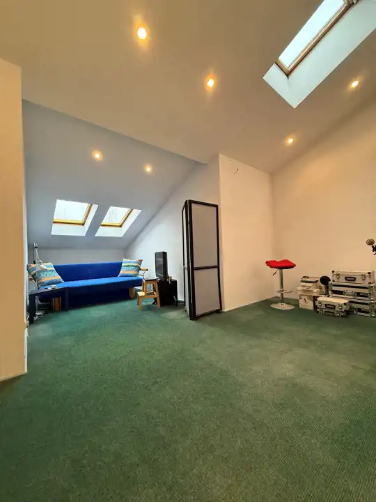 • 2 połączone ze sobą pokoje o łącznej powierzchni liczonej po podłodze ok 27 mkw (sufit wysokości 1,2-3,8m). Możliwość wydzielenia pokoi z uwagi na okna które są w każdym z pomieszczeń.