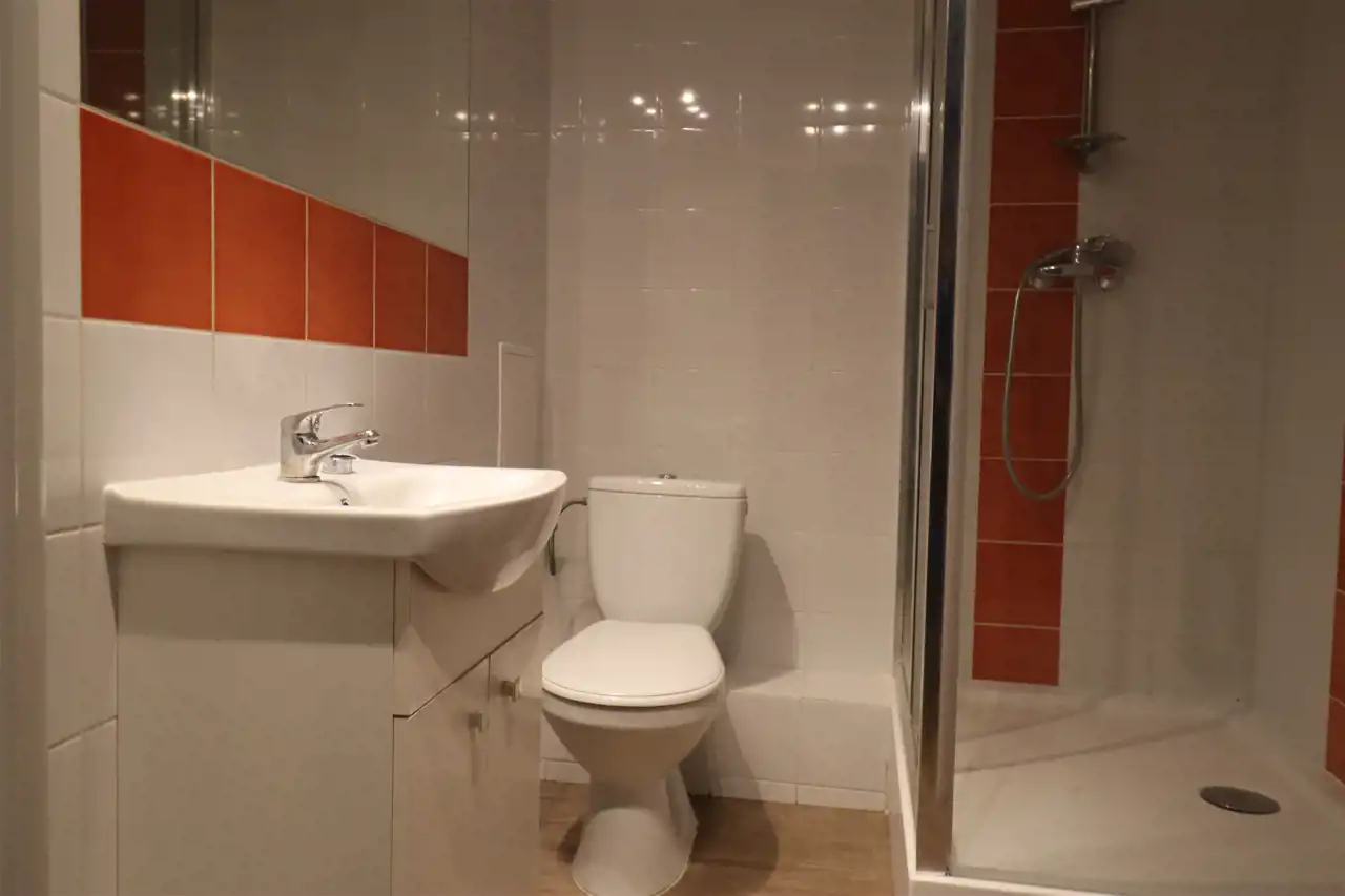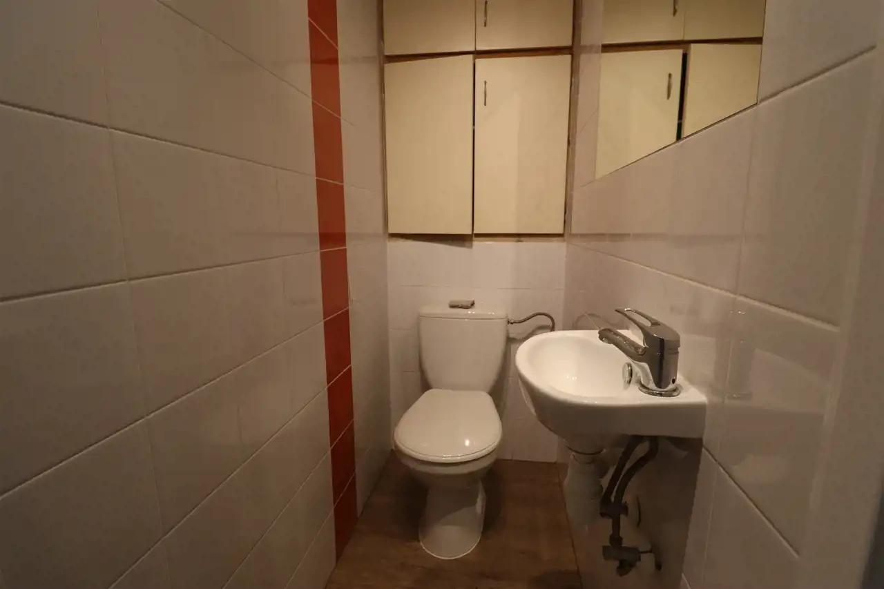 W łazience i toalecie glazura nowszego typu, na podłogach terakota.