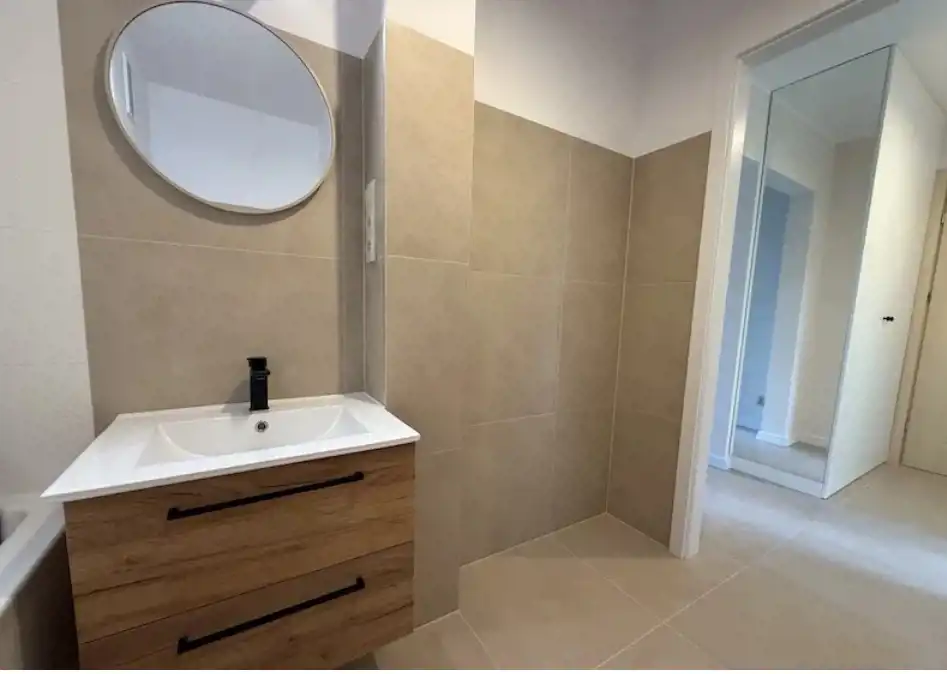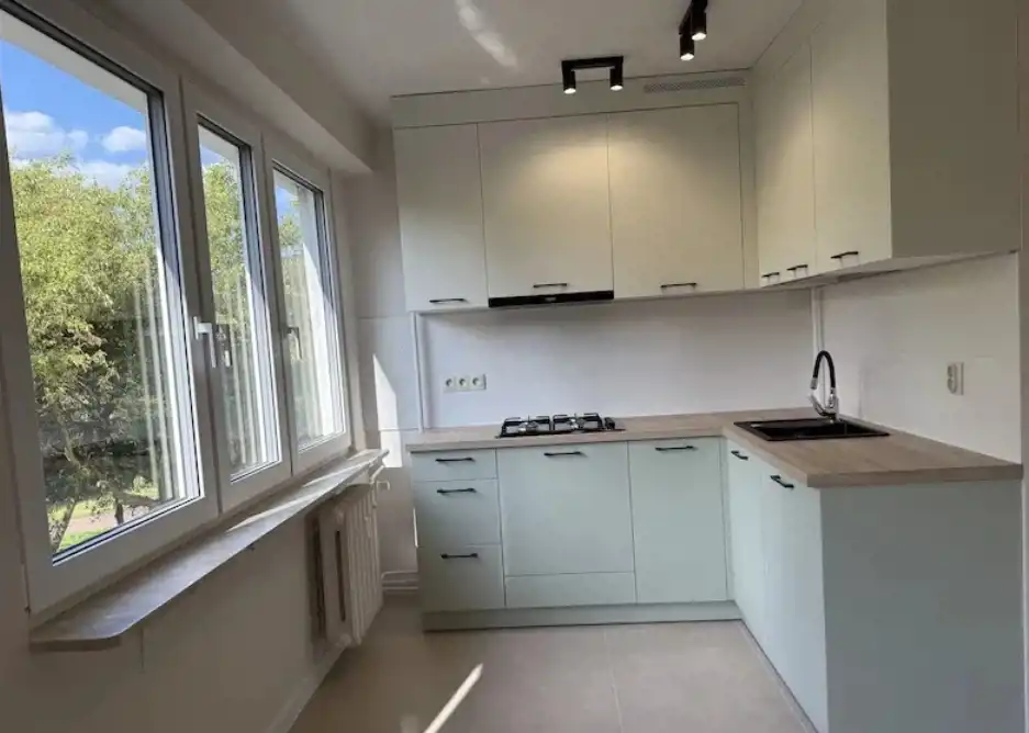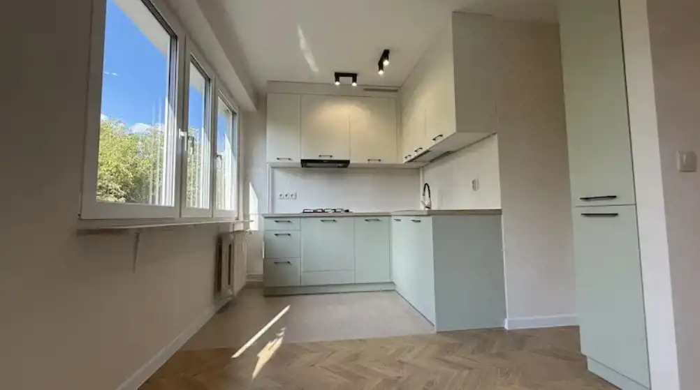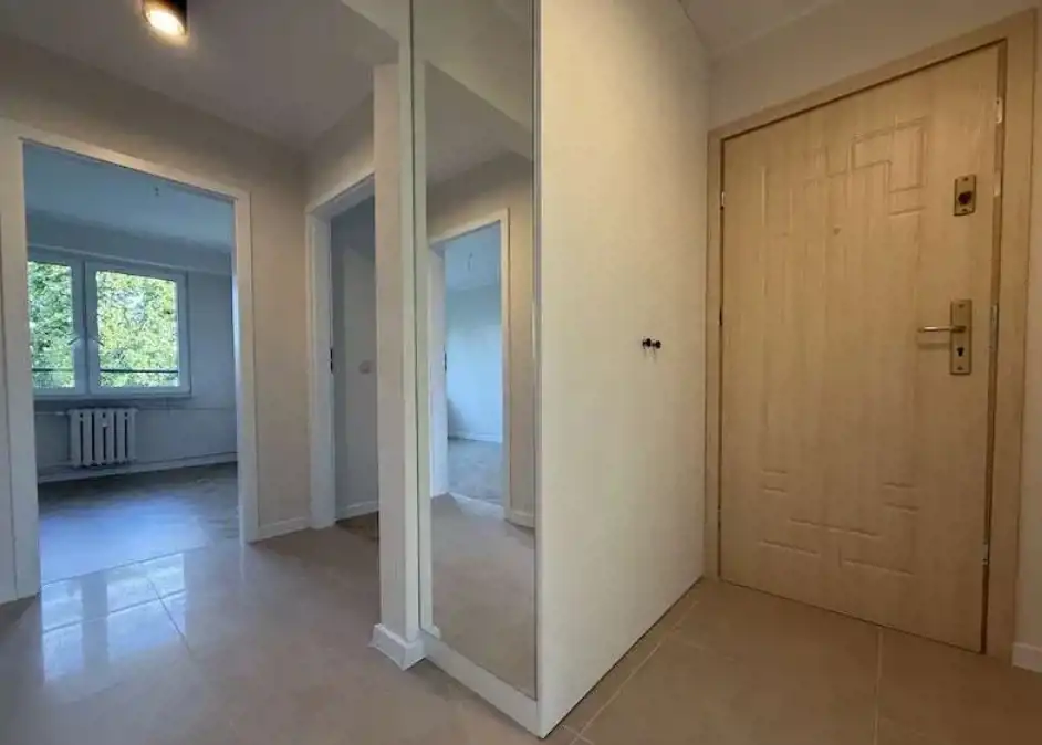 W trakcie renowacji mieszkanie zyskało nowe instalacje, podłogi, tynki i gładzie, drzwi wewnętrzne a także 3-szybowe okna z konglomeratowymi parapetami. Na podłogach położono w pokojach panele a w pozostałych pomieszczeniach gres. Wnętrza są nowoczesne i funkcjonalne; ściany mają neutralny, kaszmirowy odcień.