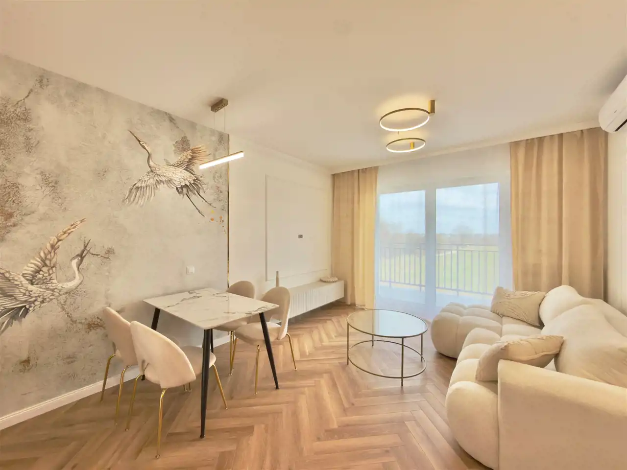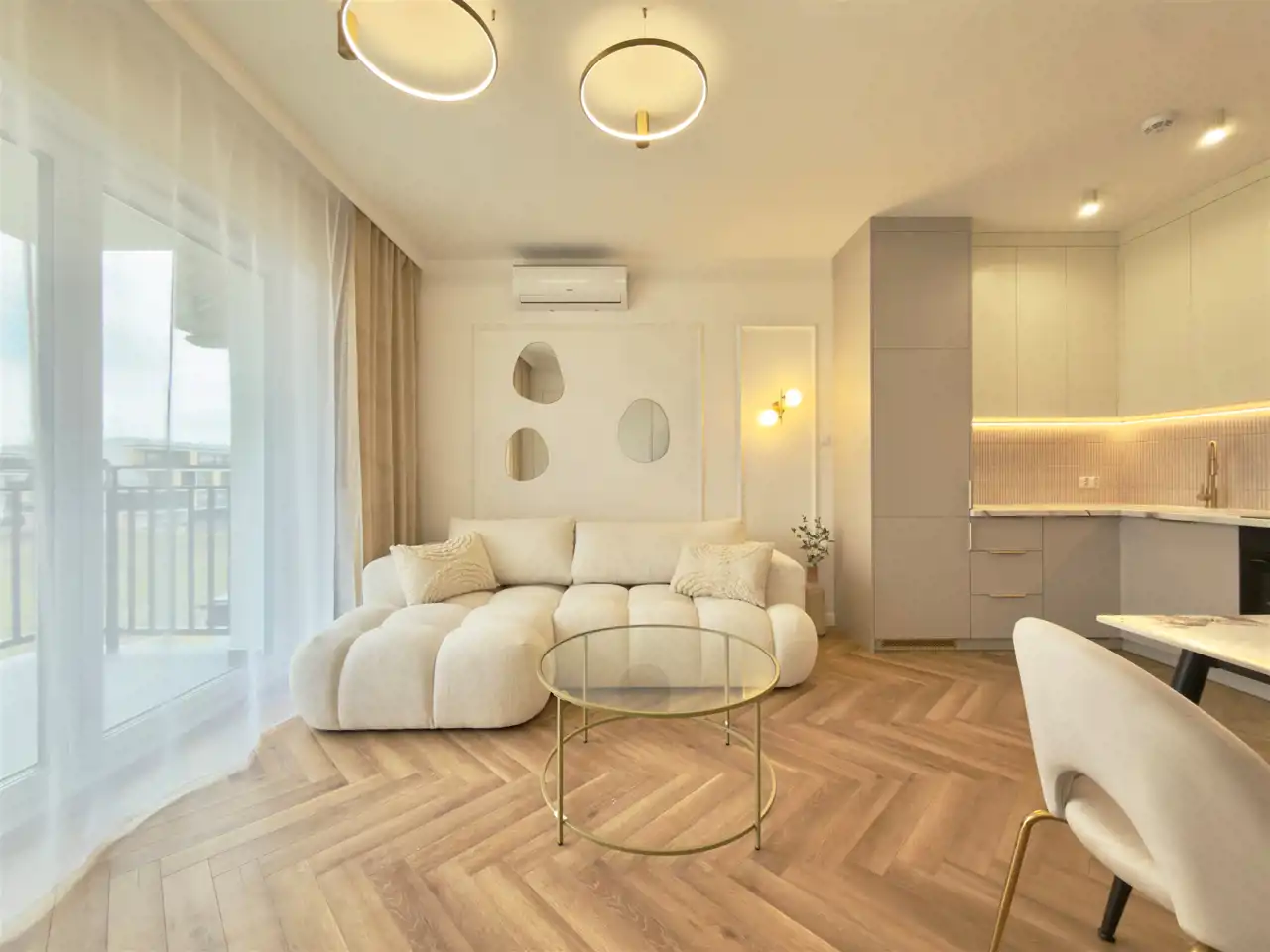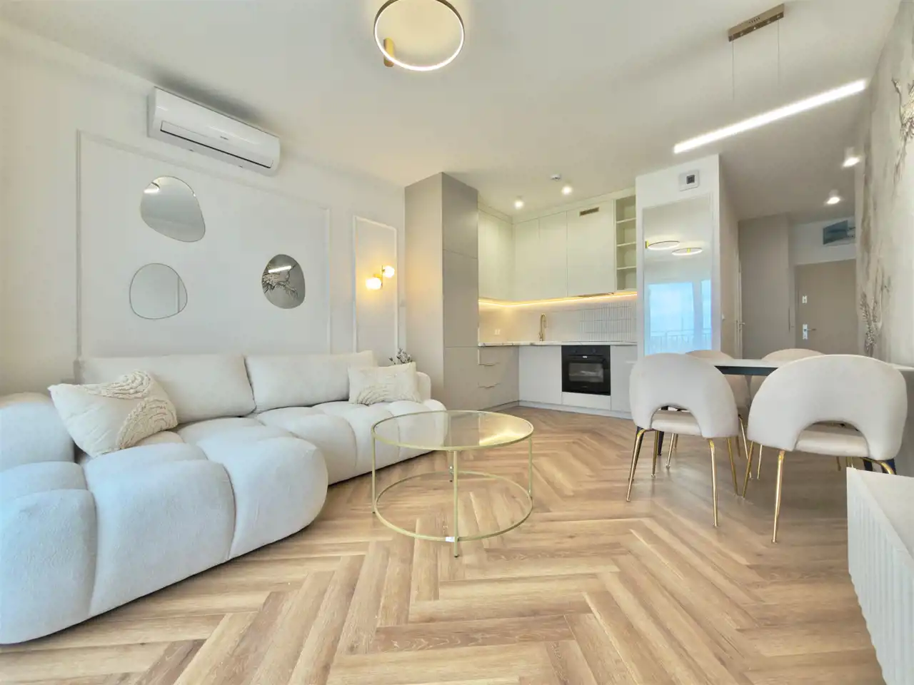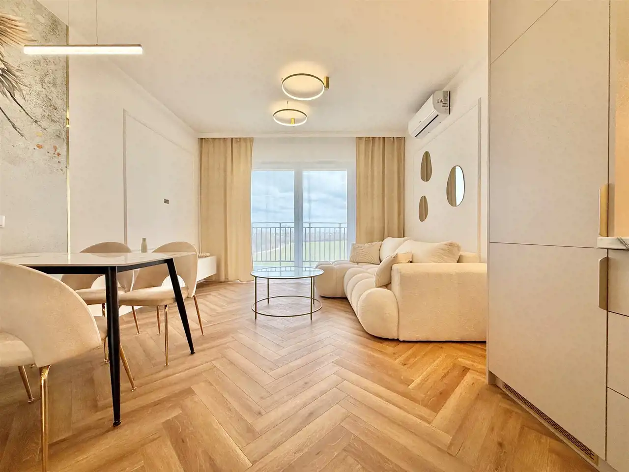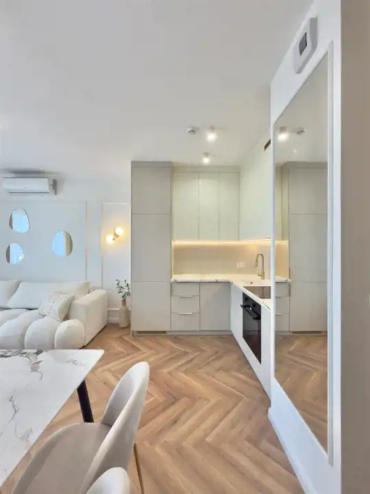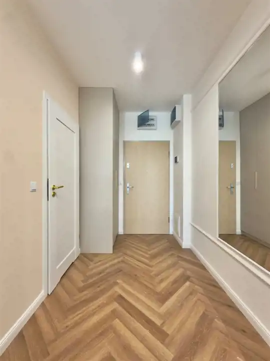 Piętro 2/3, Powierzchnia 44,5 m2 składa się z salonu z aneksem kuchennym, sypialni, łazienki z WC oraz przedpokoju. Mieszkanie posiada duży balkon z widokiem na tereny zielone. Mieszkanie ma bardzo funkcjonalny układ. Całe mieszkanie jest w pełni umeblowane i wyposażone w wysokim standardzie z dbałością o szczegóły tak jak na zdjęciach. Wyposażenie zawarte jest w cenie. Aneks kuchenny w nowoczesnej zabudowie wyposażone jest w zmywarkę, piekarnik, płytę indukcyjną, lodówko-zamrażarkę.