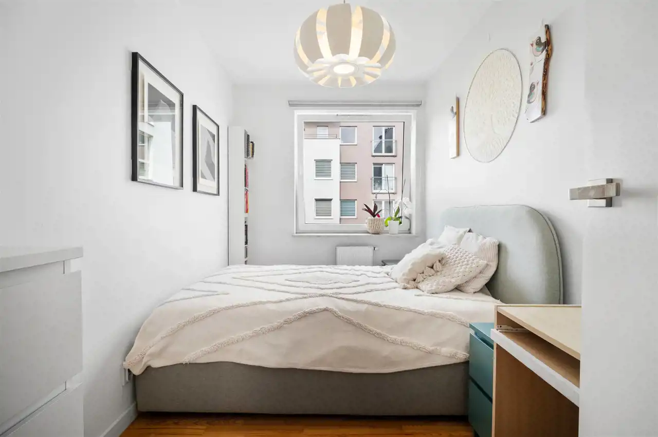 Urządzona jest w jasnych barwach tworzy przytulną, spokojną przestrzeń idealną do odpoczynku. Centralnym punktem pomieszczenia jest wygodne łóżko z tapicerowanym zagłówkiem. Drewniana podłoga dodaje wnętrzu ciepła, a duże okno zapewnia naturalne doświetlenie.