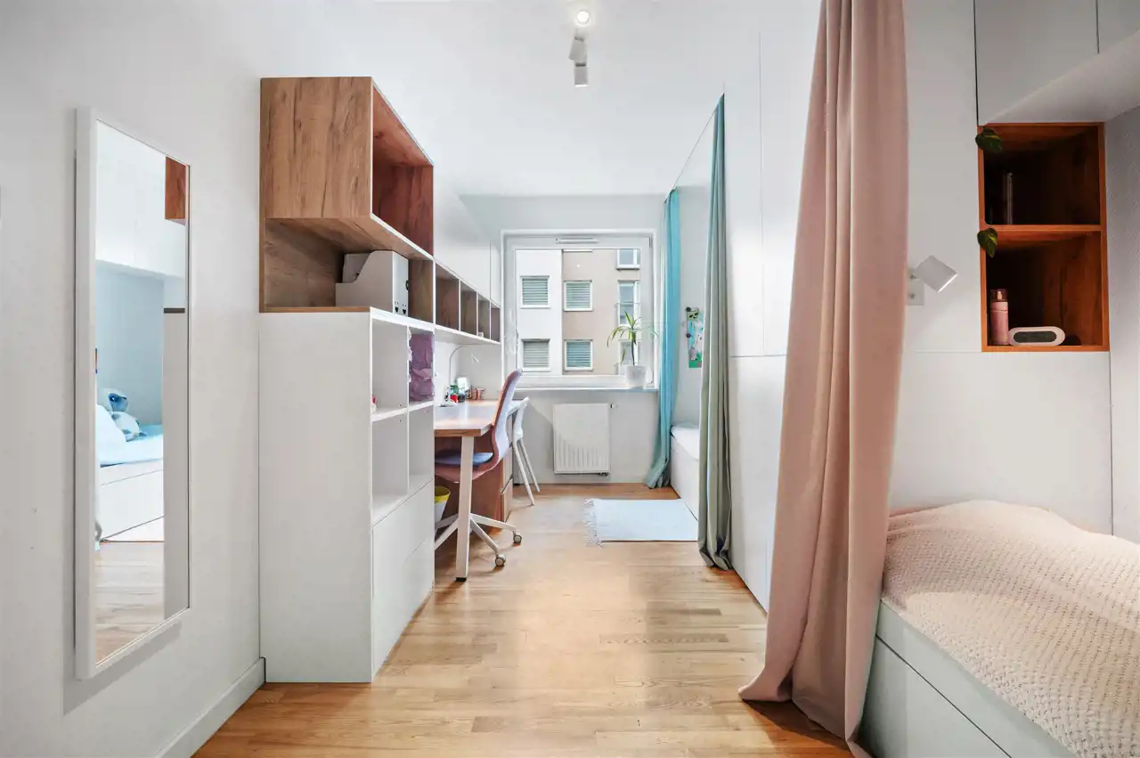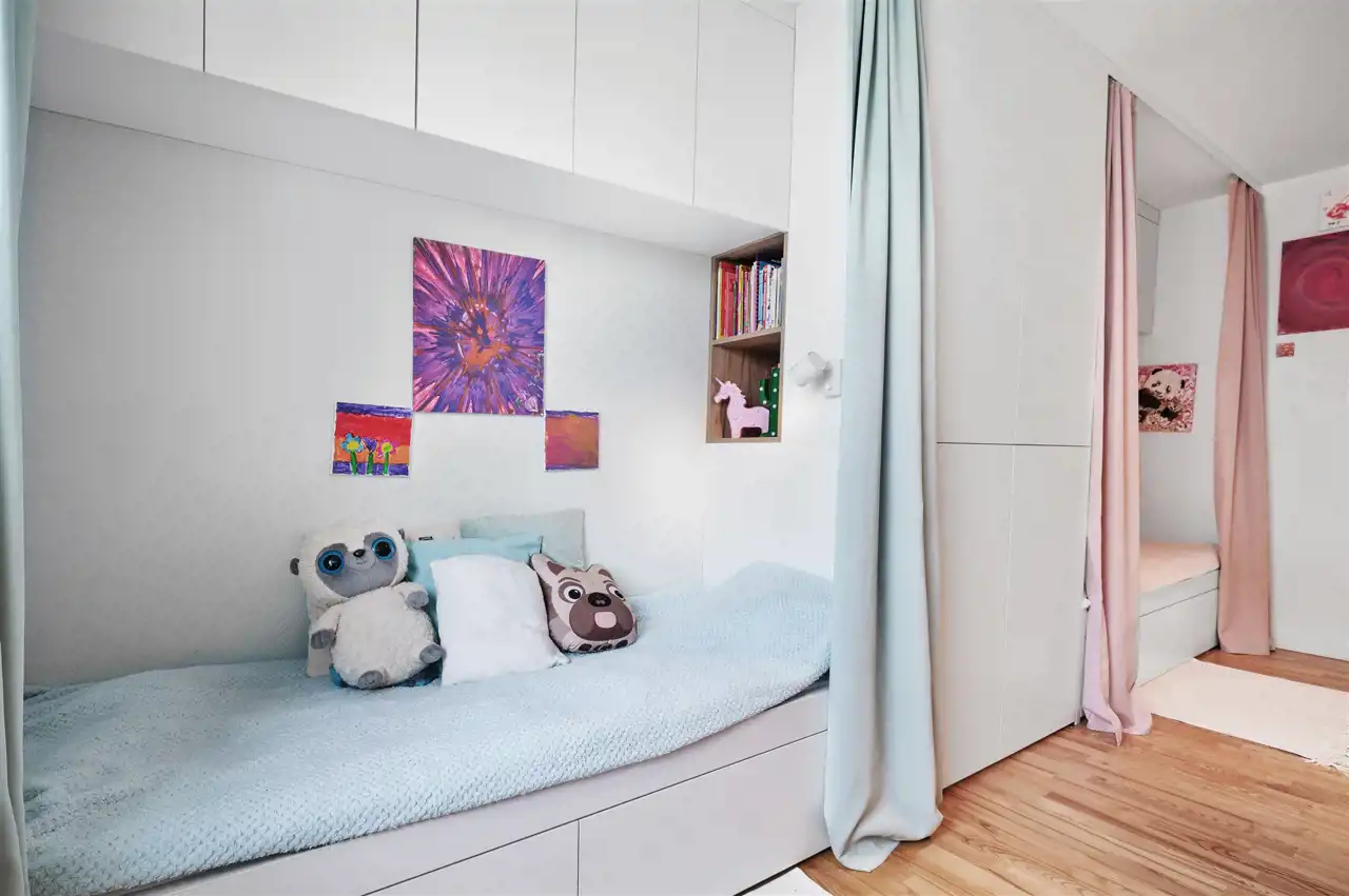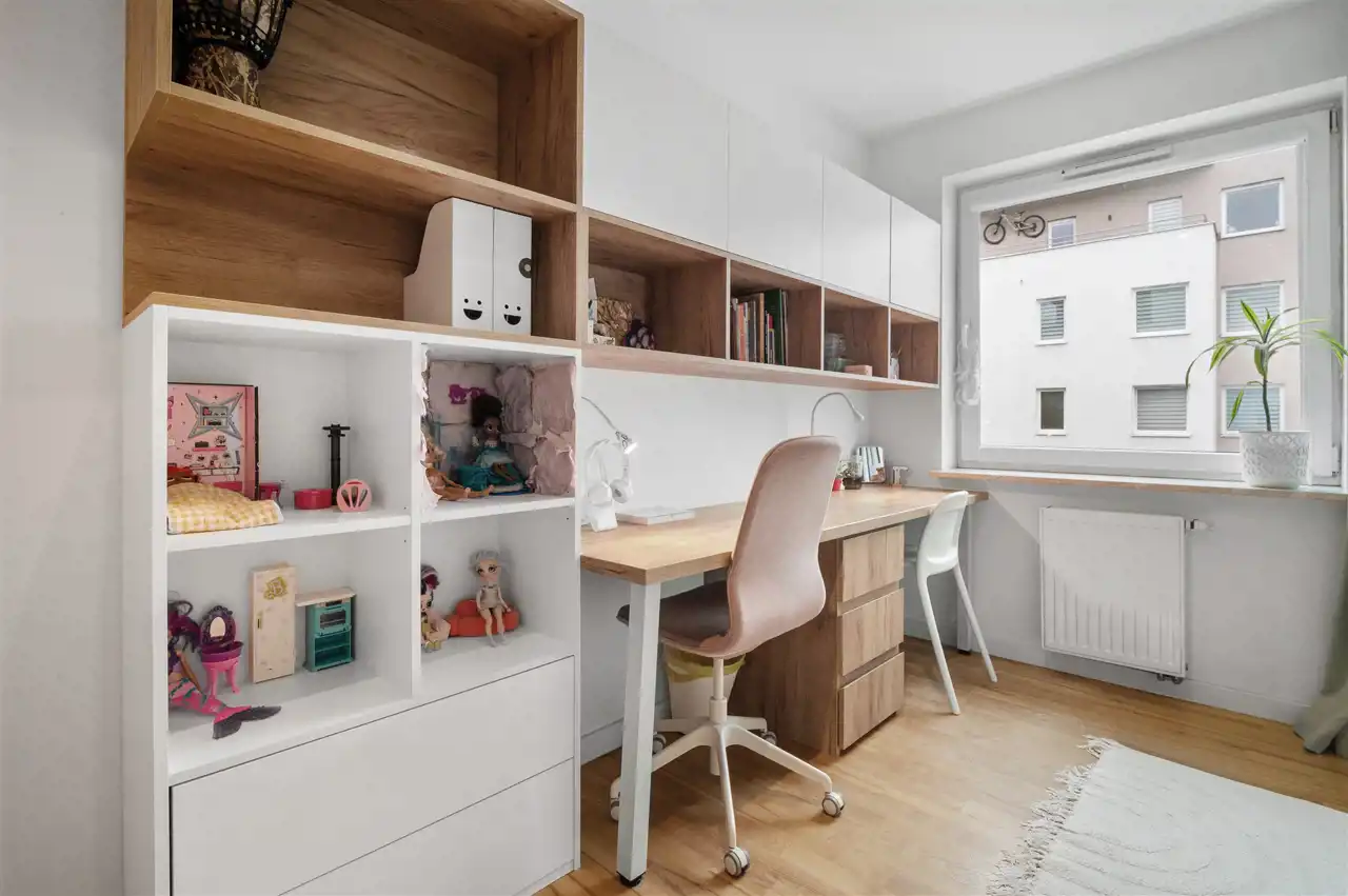 Zaprojektowany z myślą o funkcjonalności i komforcie dla dzieci. Pokój został podzielony na dwie strefy- po jednej stronie znajdują się dwa łóżka zabudowane w eleganckiej, białej stolarce z funkcjonalnymi schowkami i zasłonami zapewniającymi intymność. Centralnie umieszczona szafa pełni rolę praktycznej strefy do przechowywania. Po przeciwnej stronie pokoju znajduje się część do nauki – dwa biurka z wygodnymi krzesłami oraz systemem półek i szafek, które pozwalają utrzymać porządek i dobrą organizację przestrzeni. Jasne kolory, kolor naturalnego drewna i duże okno wprowadzają do wnętrza dużo światła, sprawiając, że pokój jest jednocześnie funkcjonalny, przytulny i przyjazny dla dzieci.