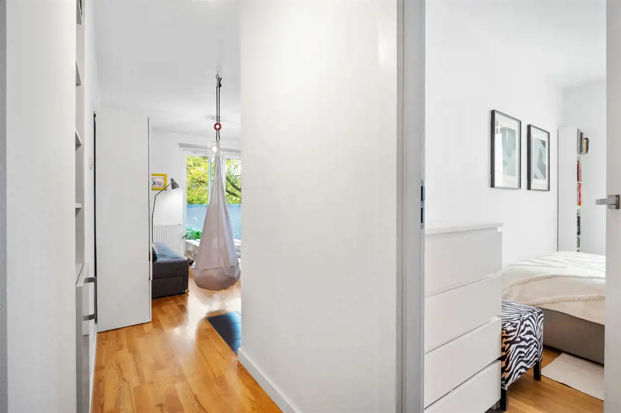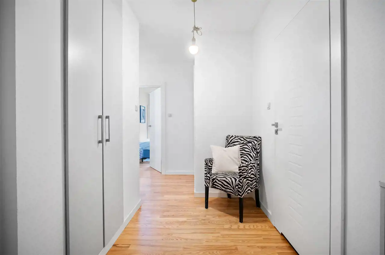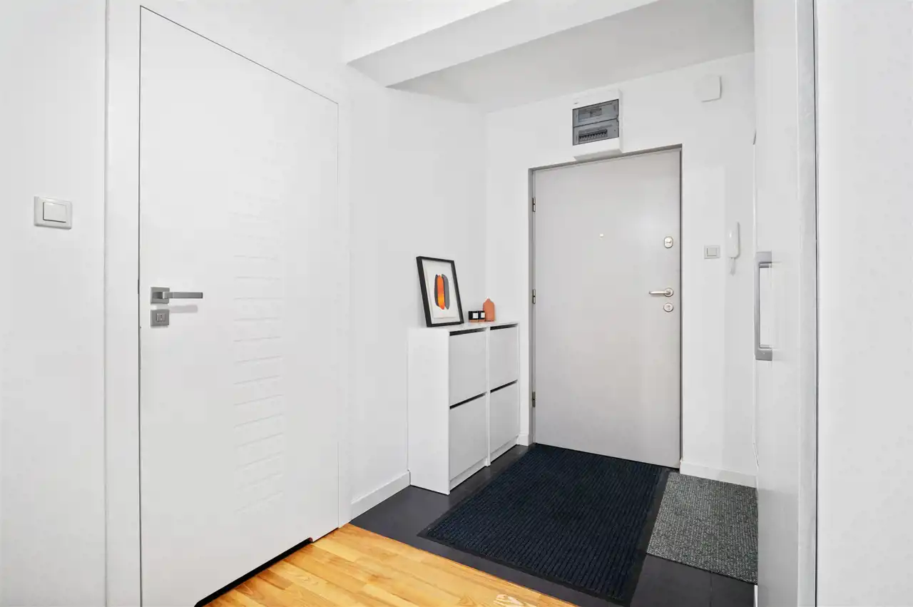 Przestronny przedpokój stanowi eleganckie wprowadzenie do mieszkania — utrzymany w jasnej tonacji, z zabudową zapewniającą wygodne miejsce do przechowywania. Drewniana podłoga dodaje mu ciepła, a strefa wejściowa została praktycznie zorganizowana, by ułatwić codzienne funkcjonowanie.
