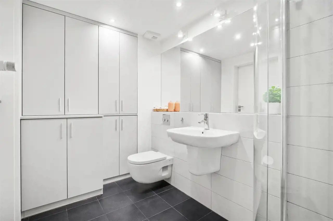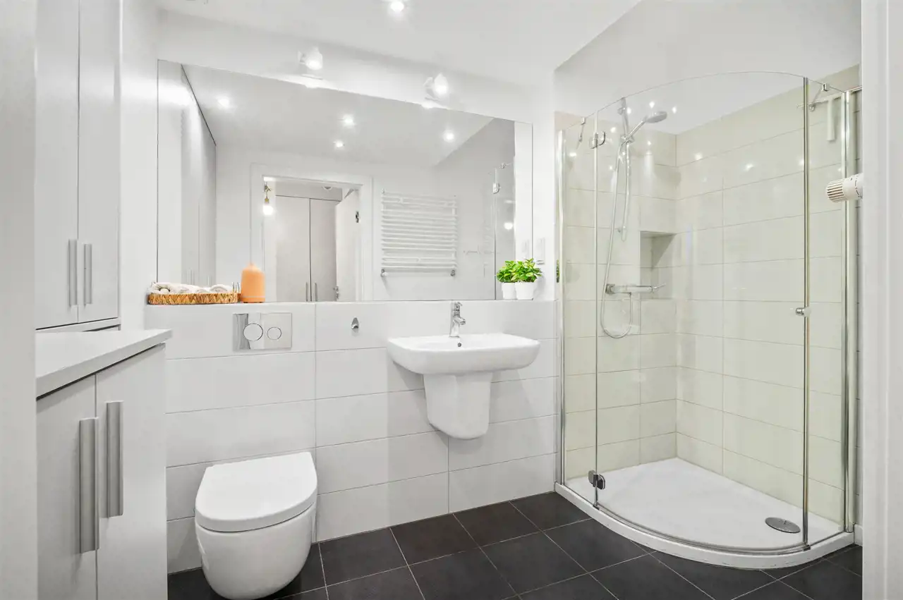 Została urządzona w nowoczesnym, minimalistycznym stylu. Dominuje w niej biel, która optycznie powiększa przestrzeń i nadaje wnętrzu świeżości. Praktyczna zabudowa meblowa zapewnia mnóstwo miejsca do przechowywania, a w jednej z szaf dyskretnie ukryto pralkę, co pozwala zachować estetykę i porządek. Wygodny prysznic z przeszkloną kabiną oraz duże lustro dodają wnętrzu lekkości i elegancji.