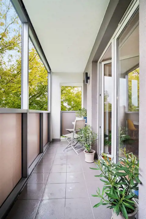 Balkon z widokiem na zieleń stanowi idealne miejsce na poranną kawę lub chwilę relaksu po pracy. Zadaszona przestrzeń zapewnia prywatność i komfort użytkowania o każdej porze roku.