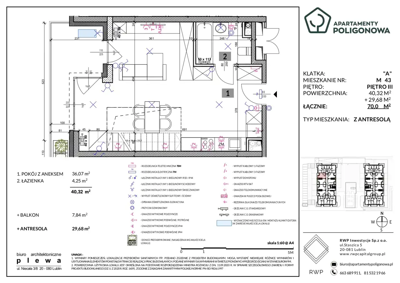 Mieszkanie z antresolą na III piętrze budynku w trakcie realizacji na Botaniku. Salon z aneksem kuchennym o pow. 36,07m2. Łazienka z WC 4,25m2 z wyjściem na balkon. Antresola o pow. 29,68m2 z wyjściem na taras.