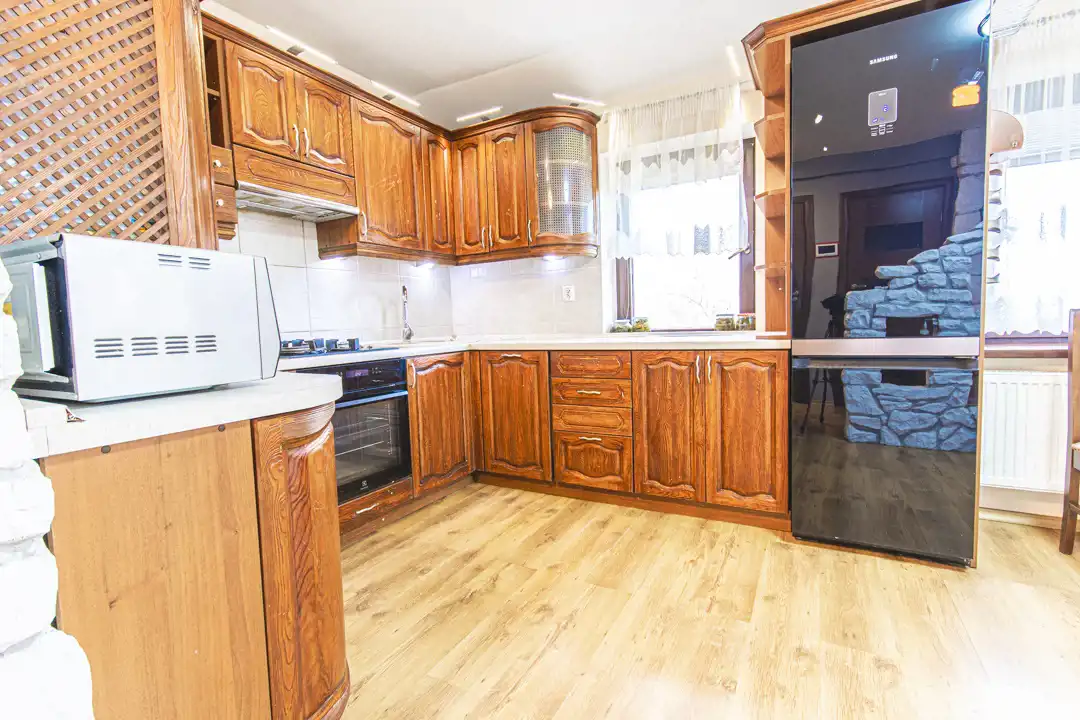 duża, jasna kuchnia z drewnianą zabudową oraz wykończeniem z naturalnego kamienia